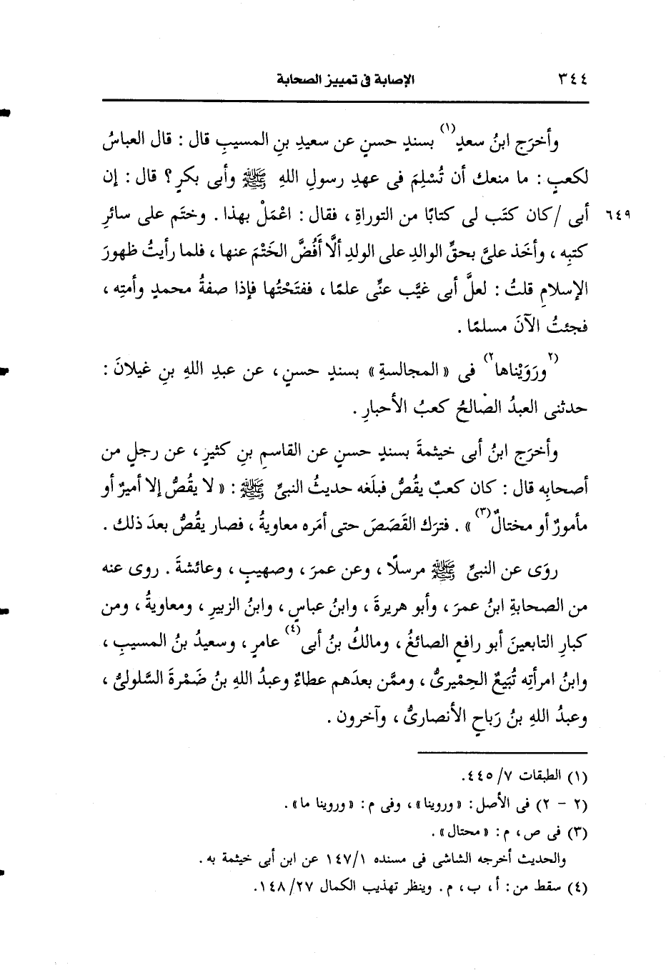 وأخرج ابن سعد بسند حسن، عَن سعيد بن المسيب قال قال العباس لكعب ما منعك ان تسلم في عهد رسول الله صَلى الله عَلَيه وسَلم وأبي بكر قال إن أبي كان كتب لي كتابا من التوراة فقال اعمل بهذا وختم على سائر كتبه وأخذ على بحق الوالد على الولد الا افض الختم عنها فلما رأيت ظهور الإسلام قلت: لعل أبي غيب عنى علما ففتحتها فإذا صفة محمد وامته فجئت الآن مسلما. وروينا ما في المجالسة بسند حسن، عَن عَبد الله بن غيلان حدثني العبد الصالح كعب الأحبار.