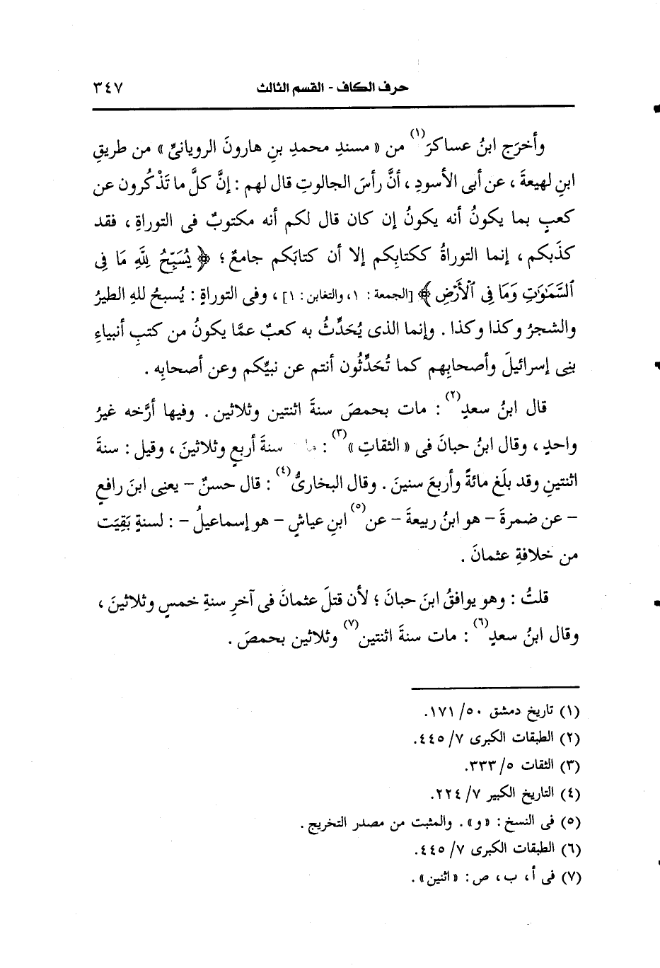 وأخرج ابن عساكر من مسند محمد بن هارون الروياني من طريق ابن لَهِيعَة، عَن أبي الأَسود ان رأس الجالوت قال لهم ان كل ما تذكرون، عَن كعب بما يكون أنه يكون ان كان قال لكم أنه مكتوب في التوراة فقد كذبكم إنما التوراة ككتابكم الا ان كتابكم جامع يسبح لله ما في السماوات وما في الأرض وفي التوراة يسبح لله الطير والشجر وكذا وكذا وانما الذي يحدث به كعب عما يكون من كتب أنبياء بني إسرائيل واصحابهم كما تحدثون أنتم، عَن نبيكم وعن اصحابه.