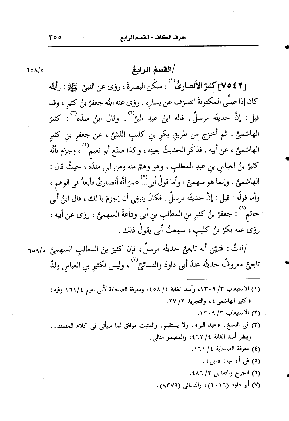 قلت: فتبين أنه تابعي حديثه مرسل فان كثير بن المطلب السهمي تابعي معروف حديثه عند أبي داود والنسائي وليس لكثير بن العباس ولد يسمى جعفرا فان الزبير لم يذكر له ولدا سوى يحيى وقال قد انقرض ولد كثير بن العباس.