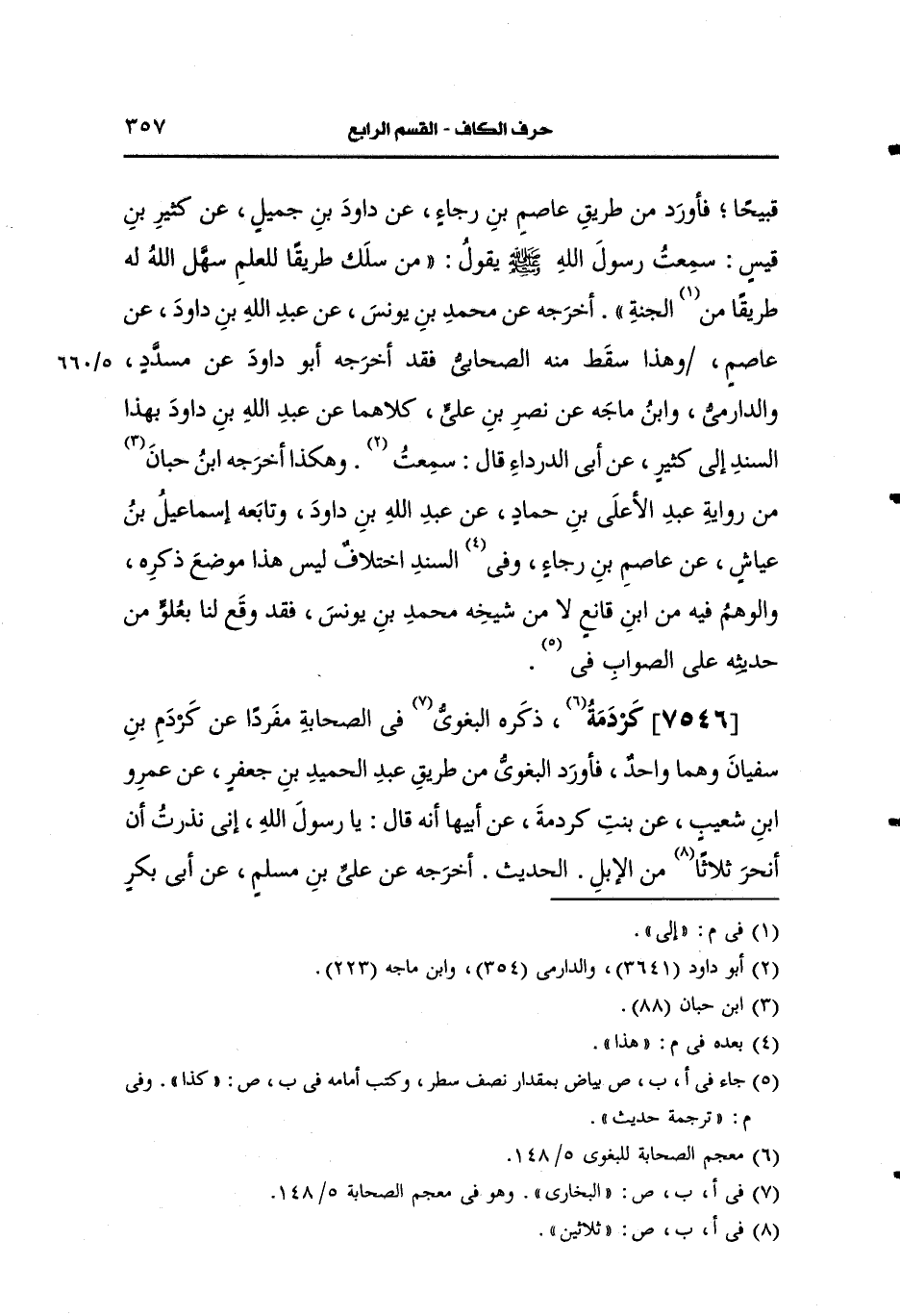 ذكره البغوي في الصحابة مفردا، عَن كردم بن سفيان وهما واحد فأورد البغوي من طريق عبد الحميد بن جعفر، عَن عَمرو بن شعيب، عَن ابنت كردمة، عَن أَبيها أنه قال يا رسول الله اني نذرت ان انحر ثلاثا من الإبل ...الحديث.