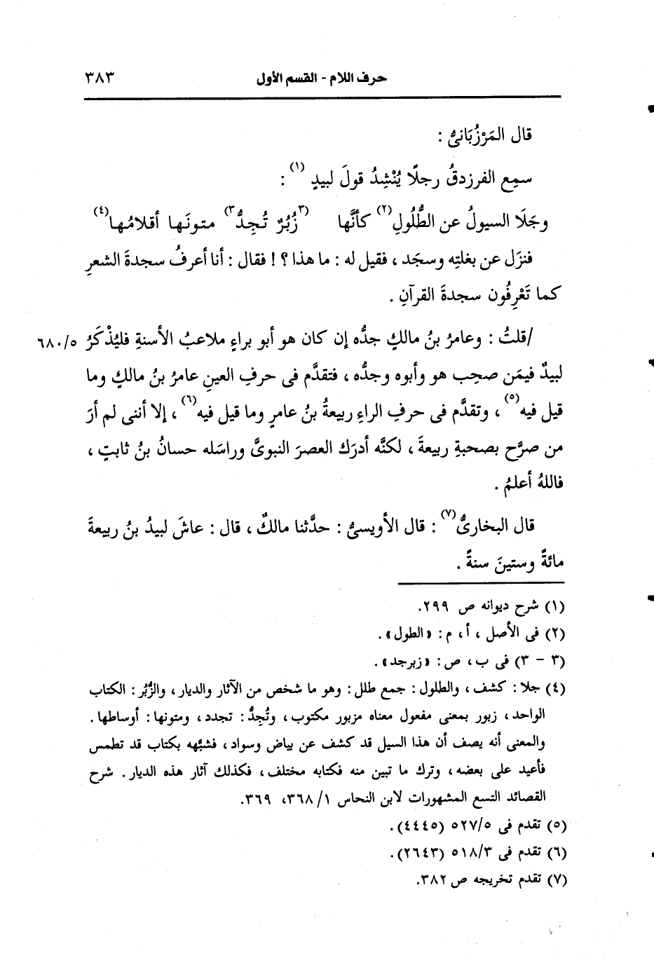 فنزل، عَن بغلته وسجد فقيل له ما هذا فقال انا اعرف سجدة الشعر كما يعرفون سجدة القرآن. قلت: وعامر بن مالك جده ان كان هو أَبو براء ملاعب الأسنة فليذكر لبيد فيمن صحب هو وأبوه وجده فتقدم في حرف العين عامر بن مالك وما قيل فيه وتقدم في حرف الراء ربيعة بن عامر وما قيل فيه الا انني لم ار من صرح بصحبة ربيعة لكنه أدرك العصر النبوي وراسله حسان بن ثابت فالله أعلم.