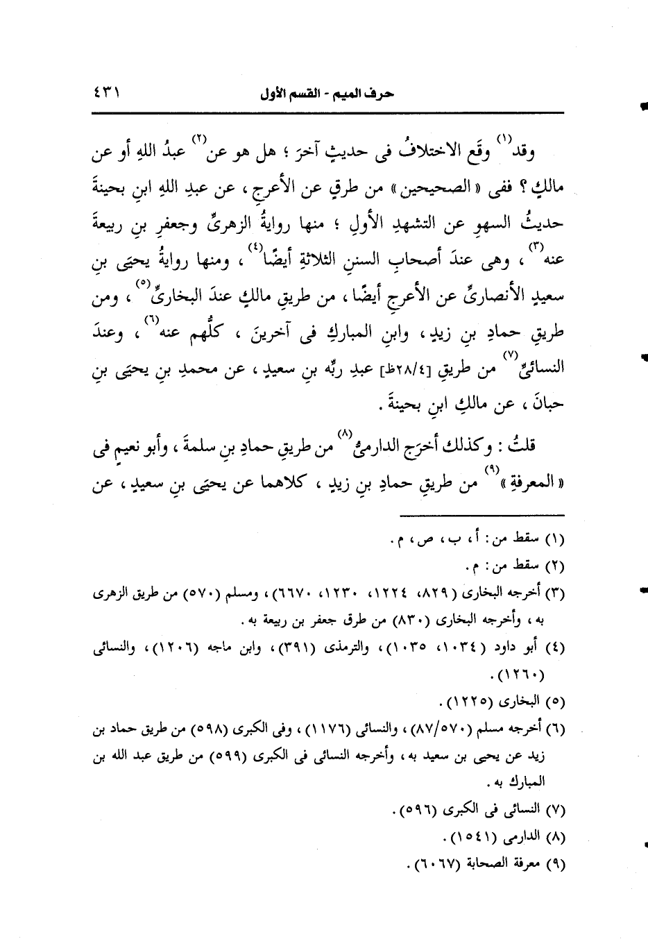 قلت: وكذلك أخرج الدارمي من طريق حماد بن سلمة، وأَبو نعيم في المعرفة من طريق حماد بن زيد كلاهما، عَن يحيى بن سعيد، عَن الأعرج، عَن مالك ابن بُحَيْنَة السكن قال النسائي هذا خطأ والصواب، عَن عَبد الله بن مالك بحينة والله أعلم.