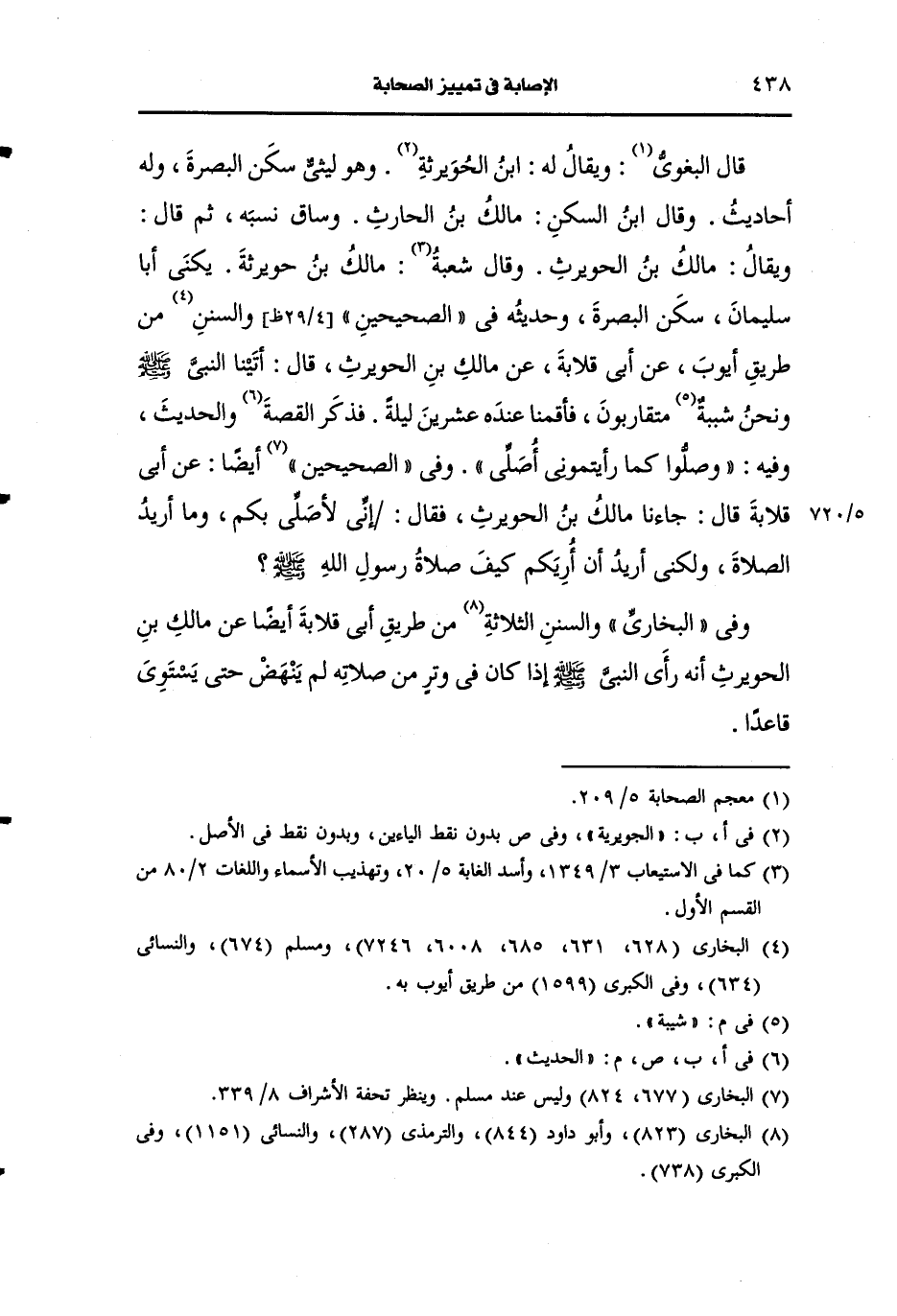 وقال شعبة مالك بن حويرثة، يُكنى أَبا سليمان سكن البصرة وحديثه في الصحيحين والسنن من طريق أيوب، عَن أبي قلابة، عَن مالك بن الحويرث قال أتينا النَّبيّ صَلى الله عَلَيه وسَلم ونحن شيبة متقاربون فاقمنا عنده عشرين ليلة فذكر الحديث والحديث فيه وصلوا كما رأيتموني أصلي. وفي الصحيحين أيضًا، عَن أبي قلابة قال جاءنا مالك بن الحويرث فقال اني لاصلي بكم وما أريد الصلاة ولكني أريد ان اريكم كيف صلاة رسول الله صَلى الله عَلَيه وسَلم.