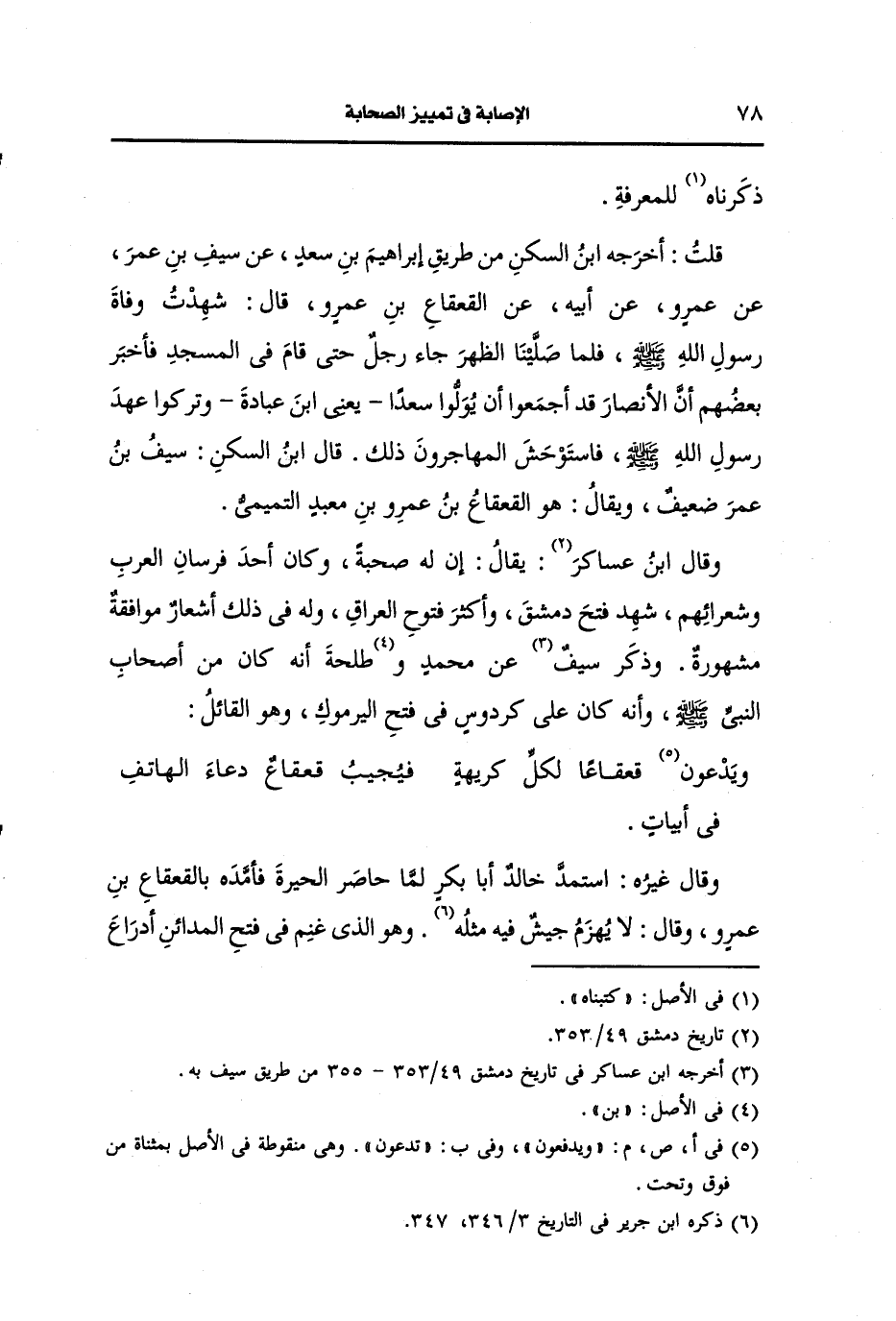 قال ابن السَّكَن: سيف بن عمر ضعيف، ويُقال: هو القعقاع بن عَمرو بن معبد التميمي.
