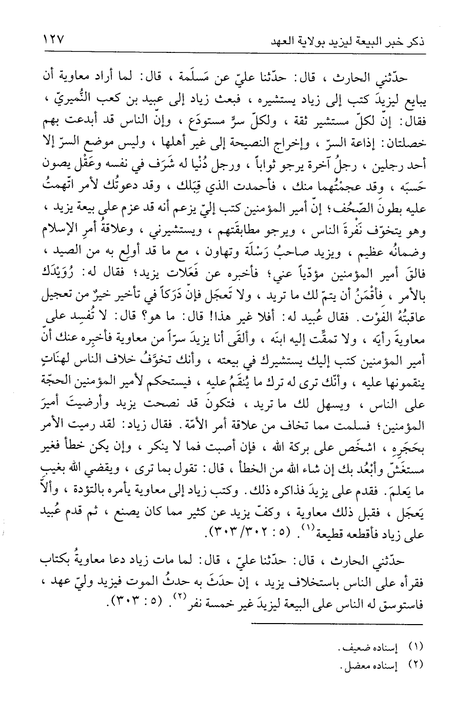 حدّثني الحارث، قال: حدّثنا عليّ، قال: لما مات زياد دعا معاويةُ بكتاب فقرأه على الناس باستخلاف يزيد، إن حدَثَ به حدثُ الموت فيزيد وليّ عهد، فاستوسق له الناس على البيعة ليزيدَ غير خمسة نفر (٢). (٥: ٣٠٣).