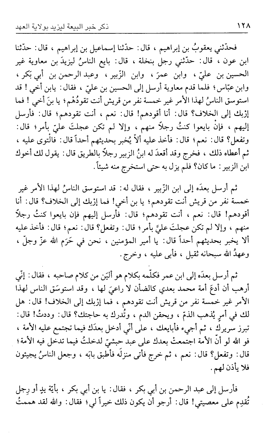 فحدّثني يعقوبُ بن إبراهيم، قال: حدّثنا إسماعيل بن إبراهيم، قال: حدّثنا ابن عون، قال: حدّثني رجل بنخلة، قال: بايع الناسُ ليزيدَ بن معاوية غير الحسين بن عليّ، وابن عمرَ، وابن الزّبير، وعبد الرحمن بن أبي بَكر، وابن عبّاس؛ فلما قدم معاوية أرسل إلى الحسين بن عليّ، فقال: يا بن أخي! قد استوسق الناسُ لهذا الأمر غير خمسة نفر من قريش أنت تقودُهْم؛ يا بنَ أخي! فما إرْبك إلى الخلاف؟ قال: أنا أقودهم! قال: نعم، أنت تقودهم؛ قال: فأرسل إليهم، فإنْ بايعوا كنتُ رجلًا منهم، وإلا لم تكن عجلتَ عليّ بأمر؛ قال: وتفعل؟ قال: نعم، قال: فأخذ عليه ألّا يُخبر بحديثهم أحدًا قال: فالْتوى عليه، ثم أعطاه ذلك، فخرج وقد أقعدَ له ابنُ الزبير رجلًا بالطريق قال: يقول لك أخوك ابن الزبير: ما كان؟ فلم يزل به حتى استخرج منه شيئًا.