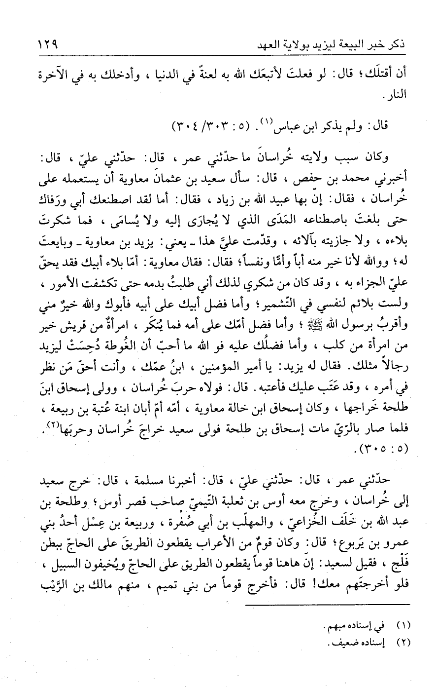 وكان سبب ولايته خُراسانَ ما حدّثني عمر، قال: حدّثني عليّ، قال: أخبرني محمد بن حفص، قال: سأل سعيد بن عثمان معاوية أن يستعمله على خُراسان، فقال: إنّ بها عبيد الله بن زياد، فقال: أما لقد اصطنعك أبي ورَفاك حتى بلغتَ باصطناعه المَدَى الذي لا يُجارَى إليه ولا يُسامَى، فما شكرتَ بلاءه، ولا جازيته بآلائه، وقدّمت عليَّ هذا -يعني: يزيد بن معاوية- وبايعتَ له؛ ووالله لأنا خير منه أبًا وأمًّا ونفسًا؛ فقال: فقال معاوية: أمّا بلاء أبيك فقد يحقّ عليّ الجزاء به، وقد كان من شكري لذلك أني طلبتُ بدمه حتى تكشفت الأمور، ولست بلائم لنفسي في التّشمير؛ وأما فضل أبيك على أبيه فأبوك والله خيرٌ مني وأقربُ برسول الله - صلى الله عليه وسلم -؛ وأما فضل أمّك على أمه فما يُنكَر، امرأةٌ من قريش خير من امرأة من كلب، وأما فضلُك عليه فو الله ما أحبّ أن الغُوطة دُحِسَتْ ليزيد رجالًا مثلك. فقال له يزيد: يا أمير المؤمنين، ابنُ عمّك، وأنت أحقّ مَن نظر في أمره، وقد عَتَب عليك فأعتبه. قال: فولاه حربَ خُراسان، وولى إسحاق ابنَ طلحة خَراجها، وكان إسحاق ابن خالة معاوية، أمّه أمّ أبان ابنة عُتبة بن ربيعة، فلما صار بالرّيّ مات إسحاق بن طلحة فولى سعيد خراجَ خُراسان وحربَها (٢). (٣٠٥: ٥).