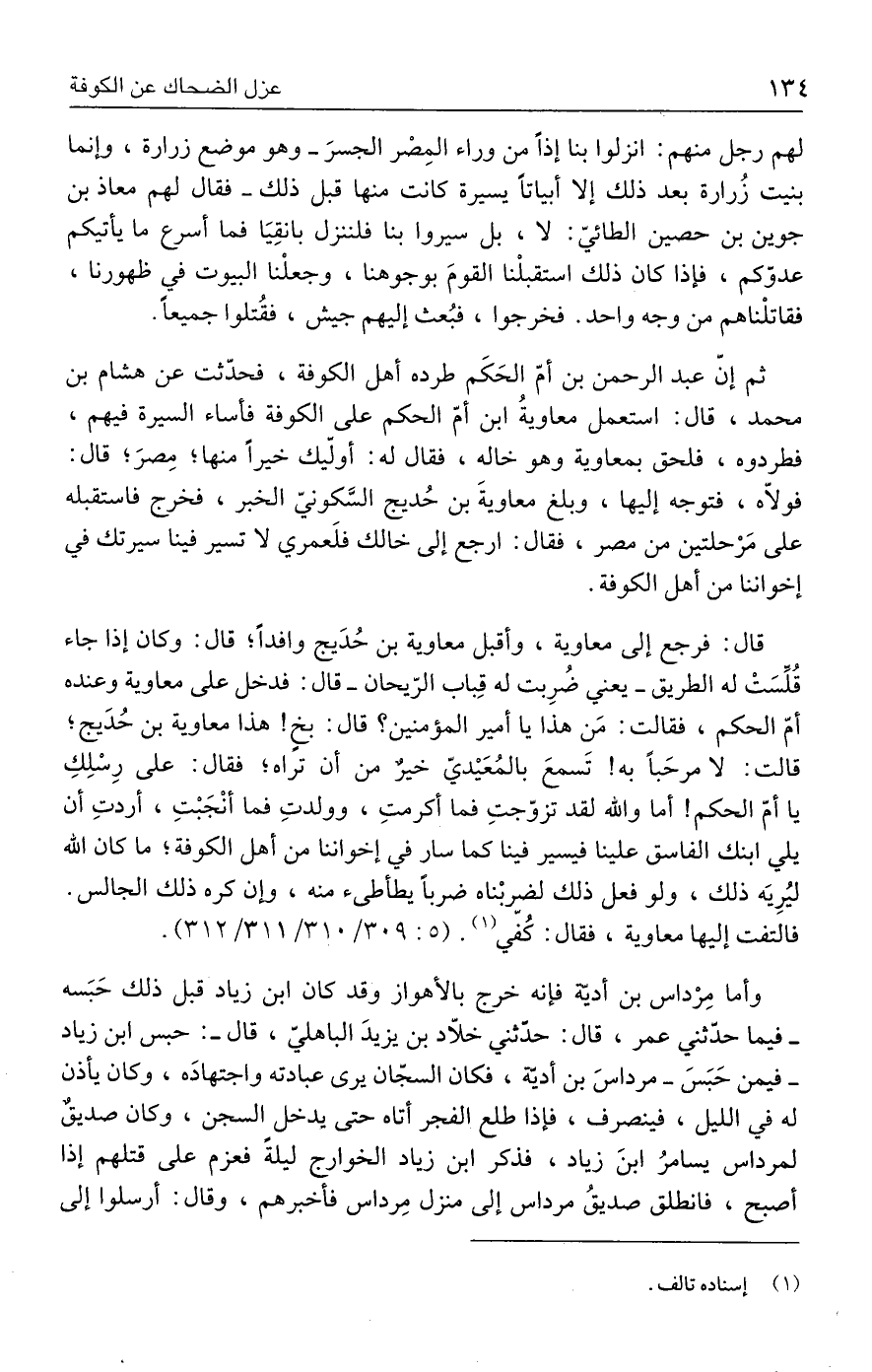 قال: فرجع إلى معاوية، وأقبل معاوية بن حُدَيج وافدًا؛ قال: وكان إذا جاء قُلِّسَتْ له الطريق -يعني ضُرِبت له قِباب الرّيحان- قال: فدخل على معاوية وعنده أمّ الحكم، فقالت: مَن هذا يا أمير المؤمنين؟ قال: بخٍ! هذا معاوية بن حُدَيج؛ قالت: لا مرحَبًا به! تَسمعَ بالمُعَيْديّ خيرٌ من أن تراه؛ فقال: على رِسْلِكِ يا أمّ الحكم! أما والله لقد تزوّجتِ فما أكرمتِ، وولدتِ فما أنْجَبْتِ، أردتِ أن يلي ابنك الفاسق علينا فيسير فينا كما سار في إخواننا من أهل الكوفة؛ ما كان الله ليُرِيَه ذلك، ولو فعل ذلك لضربْناه ضربًا يطأطئ منه، وإن كره ذلك الجالس. فالتفت إليها معاوية، فقال: كُفي (١). (٥: ٣٠٩/ ٣١٠/ ٣١١/ ٣١٢).