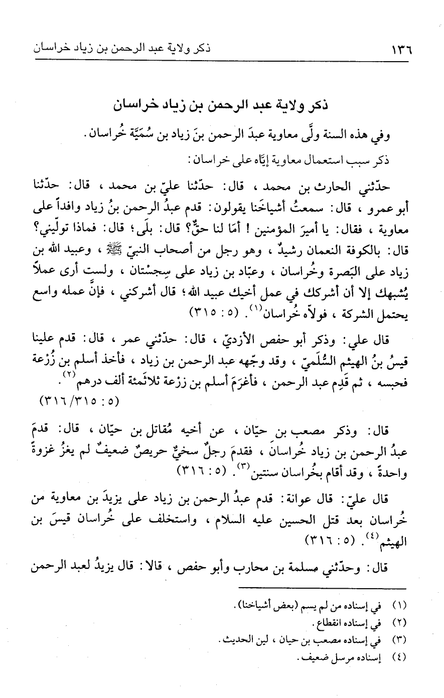 قال عليّ: قال عوانة: قدم عبدُ الرحمن بن زياد على يزيدَ بن معاوية من خُراسان بعد قتل الحسين عليه السلام، واستخلف على خُراسان قيسَ بن الهيثم (٤). (٥: ٣١٦).