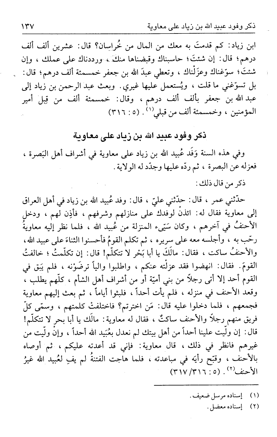 حدّثني عمر، قال: حدّثني عليّ، قال: وفد عُبيد الله بن زياد في أهل العراق إلى معاوية فقال له: ائذنْ لوفدك على منازلهم وشرفهم، فأذِن لهم، ودخل الأحنفُ في آخرهم، وكان سَيّئ المنزلة من عُبيد الله، فلما نظر إليه معاويةُ رحّب به، وأجلسه معه على سريره، ثم تكلم القومُ فأحسنوا الثناءَ على عبيد الله، والأحنفُ ساكت، فقال: ما لَكَ يا أبا بَحْر لا تتكلّم! قال: إن تكلّمتُ؛ خالفتُ القومَ. فقال: انهضوا فقد عزلْته عنكم، واطلبوا واليًا ترضَوْنه، فلم يَبق في القوم أحد إلا أتى رجلًا من بني أميّة أو من أشراف أهل الشأم، كلّهم يطلب، وقعد الأحنف في منزله، فلم يأت أحدًا، فلبثوا أيامًا، ثم بعث إليهم معاوية فجمعهم، فلما دخلوا عليه قال: مَن اخترتم؟ فاختلفتْ كلمتهم، وسمّى كلّ فريق منهم رجلًا والأحنف ساكتٌ، فقال له معاوية: مالَك يا أبا بحر لا تتكلّم! قال: إن ولّيت علينا أحدًا من أهل بيتك لم نعدل بعُبَيد الله أحدًا، وإنْ ولّيت من غيرهم فانظر في ذلك، قال معاوية: فإني قد أعدته عليكم، ثم أوصاه بالأحنف، وقبّح رأيَه في مباعدته، فلما هاجت الفتنةُ لم يفِ لعُبيد الله غيرُ الأحنف (٢). (٥: ٣١٦/ ٣١٧)