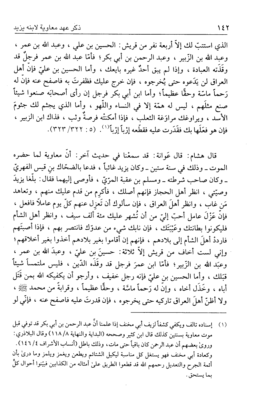 الذي استتبّ لك إلّا أربعة نفر من قريش: الحسين بن علي، وعبد الله بن عمر، وعبد الله بن الزّبير، وعبد الرحمن بن أبي بكر، فأمّا عبد الله بن عمر فرجلٌ قد وقَذَته العبادة، وإذا لم يبق أحدٌ غيره بايعك، وأما الحسين بن عليّ فإنّ أهل العراق لن يَدَعوه حتى يُخرجوه، فإن خرج عليك فظفرتَ به فاصفح عنه فإنّ له رَحمًا ماسّة وحقًّا عظيمًا؛ وأما ابن أبي بكر فرجل إن رأى أصحابَه صنعوا شيئًا صنع مثلَهم، ليس له همّة إلا في النساء واللهو، وأما الذي يجثم لك جثومَ الأسد، ويراوغك مراوَغة الثعلب، فإذا أمكنتْه فرصةٌ وثب، فذاك ابن الزبير، فإن هو فعَلَها بك فقَدَرت عليه فقطّعه إرْبًا إرْبًا (١). (٥: ٣٢٢/ ٣٢٣).