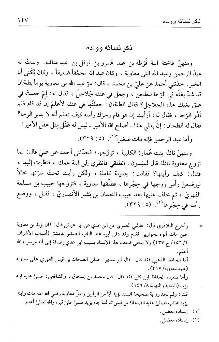 قلنا: ولم نجد رواية صحيحة المسند تؤيد أيًّا من الرأيين ولعلّ معاوية رضي الله عنه مت وابنه يزيد غائب فصلى عليه الضحاك بن قيس ثم لما جاء يزيد صلى على قبره والله تعالى أعلم.