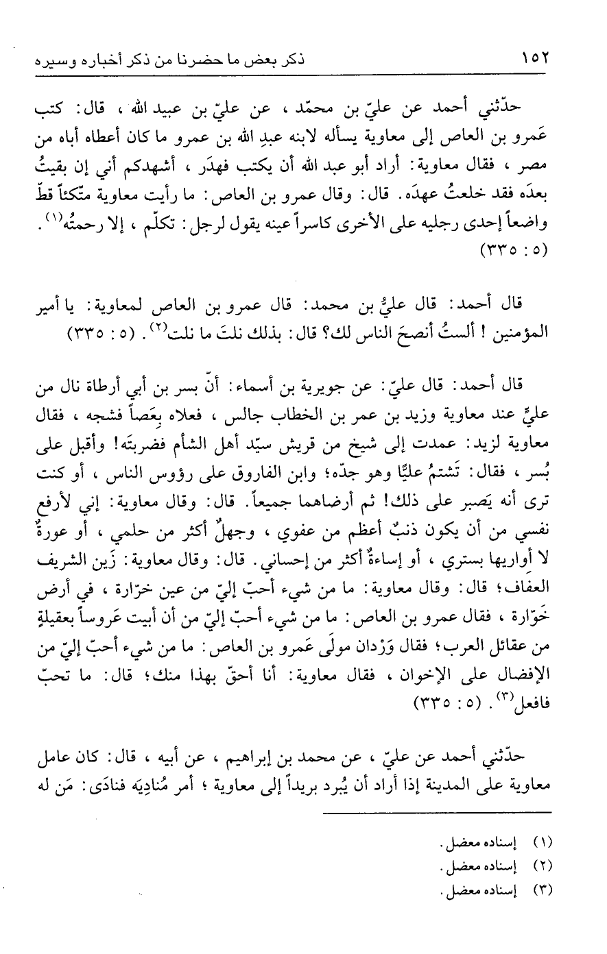 حدّثني أحمد عن على بن محمّد، عن عليّ بن عبيد الله، قال: كتب عَمرو بن العاص إلى معاوية يسأله لابنه عبدِ الله بن عمرو ما كان أعطاه أباه من مصر، فقال معاوية: أراد أبو عبد الله أن يكتب فهدَر، أشهدكم أني إن بقيتُ بعدَه فقد خلعتُ عهدَه. قال: وقال عمرو بن العاص: ما رأيت معاوية متّكئًا قطّ واضعًا إحدى رجليه على الأخرى كاسرًا عينه يقول لرجل: تكلّم، إلا رحمتُه (١). (٥: ٣٣٥)