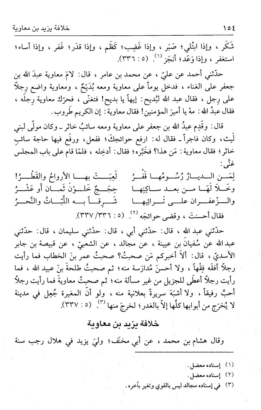 حدّثني أحمد عن عليّ، عن محمد بن عامر، قال: لامَ معاوية عبدَ الله بن جعفر على الغناء، فدخل يومًا على معاوية ومعه بُدَيْحٌ، ومعاوية واضع رِجلًا على رِجل، فقال عبد الله لبُديح: إيهًا يا بديح! فتغنّى، فحرّك معاوية رِجلَه، فقال عبدُ الله: مهْ يا أميرَ المؤمنين! فقال معاوية: إن الكريم طَروب.