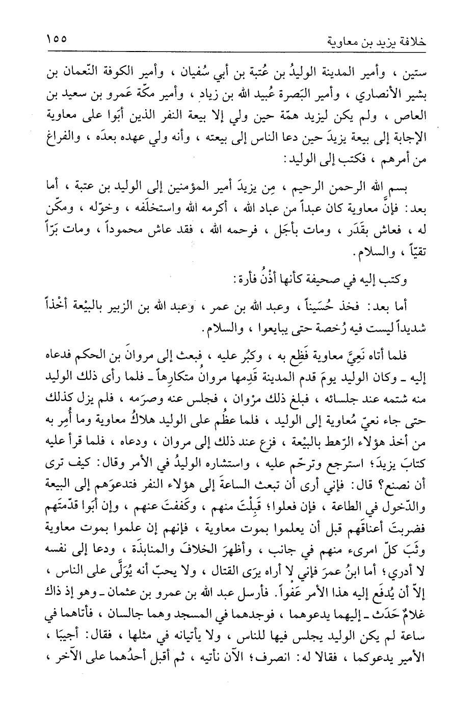 بسم الله الرحمن الرحيم، مِن يزيدَ أمير المؤمنين إلى الوليد بن عتبة، أما بعد: فإنَّ معاوية كان عبدًا من عباد الله، أكرمه الله واستخلَفه، وخوّله، ومكّن له، فعاش بقَدَر، ومات بأجَل، فرحمه الله، فقد عاش محمودًا، ومات بَرًّا تقيًّا، والسلام.