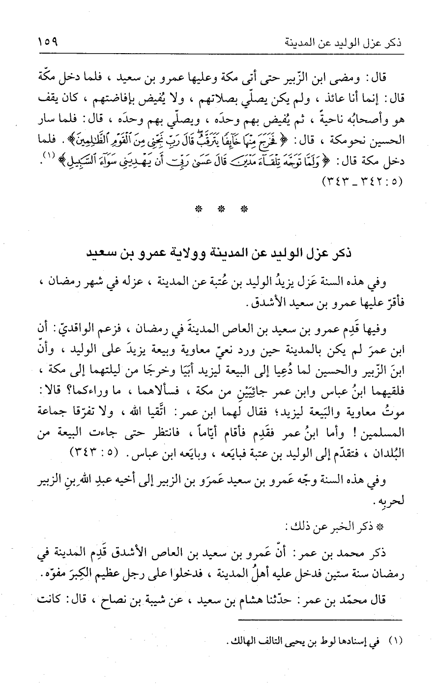 قال: ومضى ابن الزبير حتى أتى مكة وعليها عمرو بن سعيد، فلما دخل مكّة قال: إنما أنا عائذ، ولم يكن يصلّي بصلاتهم، ولا يُفيض بإفاضتهم، كان يقف هو وأصحابُه ناحيةً، ثم يُفيض بهم وحدَه، ويصلّي بهم وحدَه، قال: فلما سار الحسين نحو مكة، قال: {فَخَرَجَ مِنْهَا خَائِفًا يَتَرَقَّبُ قَالَ رَبِّ نَجِّنِي مِنَ الْقَوْمِ الظَّالِمِينَ}. فلما دخل مكة قال: {وَلَمَّا تَوَجَّهَ تِلْقَاءَ مَدْيَنَ قَالَ عَسَى رَبِّي أَنْ يَهْدِيَنِي سَوَاءَ السَّبِيلِ} (١). (٣٤٢: ٥ - ٣٤٣)