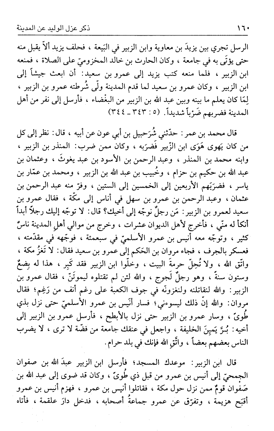 الرسل تجري بين يزيدَ بن معاوية وابن الزبير في البَيعة، فحلف يزيد ألّا يقبل منه حتى يؤتَى به في جامعة، وكان الحارث بن خالد المخزوميّ على الصلاة، فمنعه ابن الزبير، فلما منعه كتب يزيد إلى عمرو بن سعيد؛ أن ابعث جيشًا إلى ابن الزبير، وكان عمرو بن سعيد لما قدم المدينة ولّى شُرطته عمرو بن الزبير، لِمَا كان يعلم ما بينه وبين عبد الله بن الزبير من البغْضاء، فأرسل إلى نفر من أهل المدينة فضربهم ضَرْبًا شديدًا. (٥: ٣٤٣ - ٣٤٤)