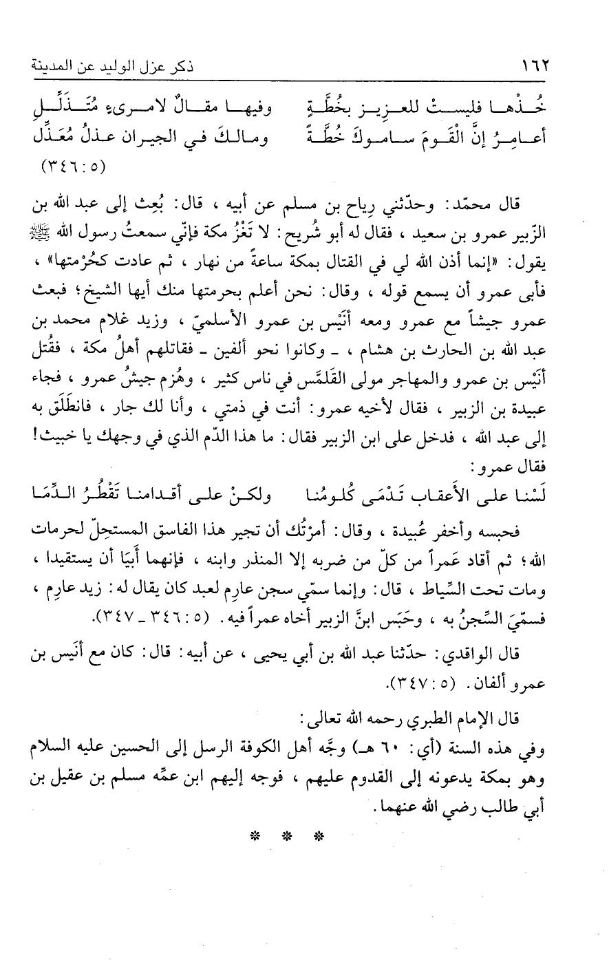 قال محمّد: وحدّثني رِياح بن مسلم عن أبيه، قال: بُعِث إلى عبد الله بن الزّبير عمرو بن سعيد، فقال له أبو شُريح: لا تَغْزُ مكة فإنّي سمعتُ رسول الله - صلى الله عليه وسلم - يقول: "إنما أذن الله لي في القتال بمكة ساعةً من نهار، ثم عادت كحُرْمتها"، فأبى عمرو أن يسمع قوله، وقال: نحن أعلم بحرمتها منك أيها الشيخ؛ فبعث عمرو جيشًا مع عمرو ومعه أنَيْس بن عمرو الأسلميّ، وزيد غلام محمد بن عبد الله بن الحارث بن هشام، -وكانوا نحو ألفين- فقاتلهم أهلُ مكة، فقُتل أنَيْس بن عمرو والمهاجر مولى القَلمَّس في ناس كثير، وهُزم جيشُ عمرو، فجاء عبيدة بن الزبير، فقال لأخيه عمرو: أنت في ذمتي، وأنا لك جار، فانطَلَق به إلى عبد الله، فدخل على ابن الزبير فقال: ما هذا الدّم الذي في وجهك يا خبيث! فقال عمرو: