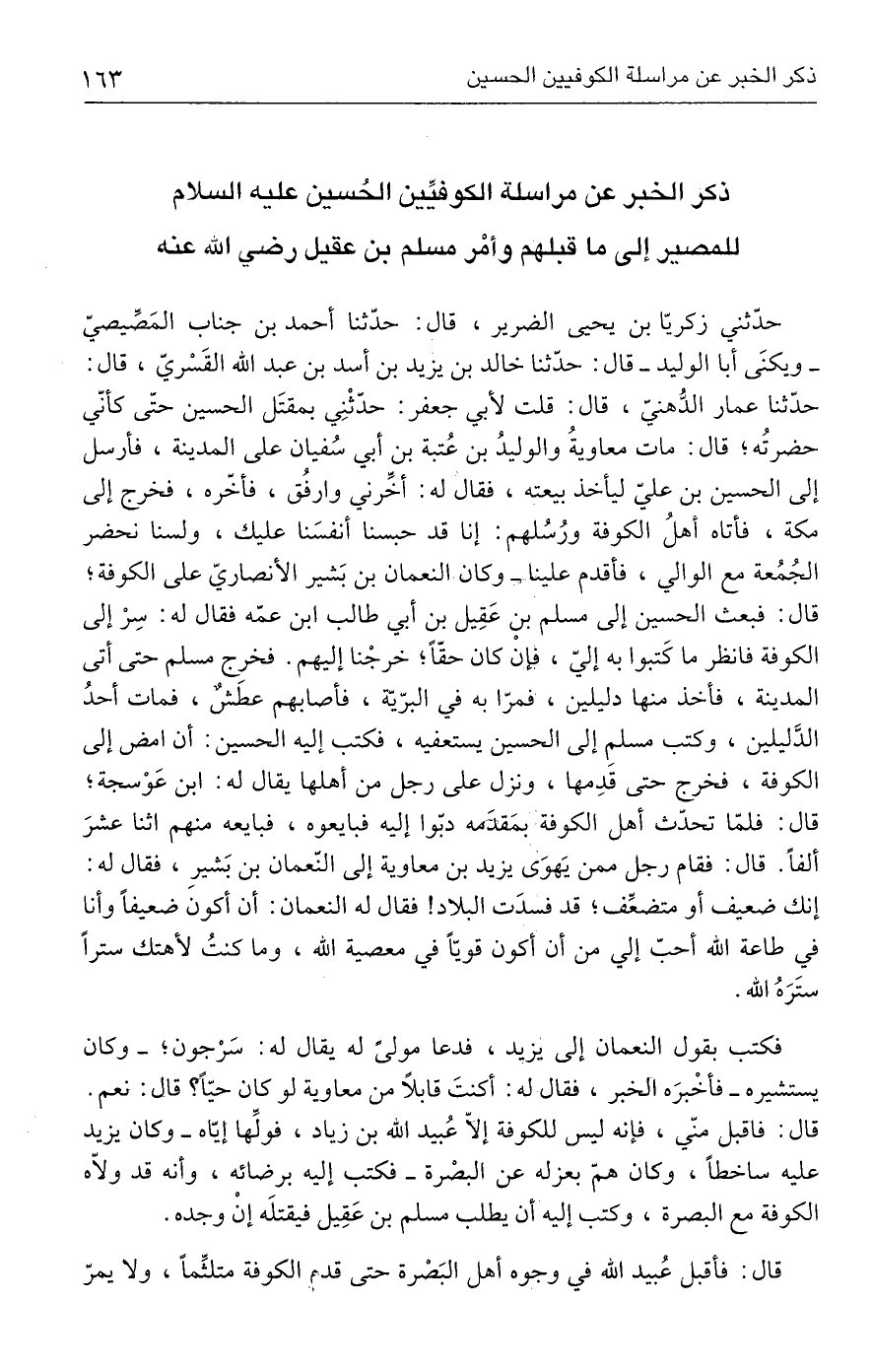 حدّثني زكريّا بن يحيى الضرير، قال: حدّثنا أحمد بن جناب المَصِّيصيّ -ويكنَى أبا الوليد- قال: حدّثنا خالد بن يزيد بن أسد بن عبد الله القَسْريّ، قال: حدّثنا عمار الدُّهنيّ، قال: قلت لأبي جعفر: حدّثْنِي بمقتَل الحسين حتّى كأنّي حضرتُه؛ قال: مات معاويةُ والوليدُ بن عُتبة بن أبي سُفيان على المدينة، فأرسل إلى الحسين بن عليّ ليأخذ بيعته، فقال له: أخِّرني وارفُق، فأخّره، فخرج إلى مكة، فأتاه أهلُ الكوفة ورُسُلهم: إنا قد حبسنا أنفسَنا عليك، ولسنا نحضر الجُمُعة مع الوالي، فأقدم علينا- وكان النعمان بن بَشير الأنصاريّ على الكوفة؛ قال: فبعث الحسين إلى مسلم بن عَقِيل بن أبي طالب ابن عمّه فقال له: سِرْ إلى الكوفة فانظر ما كَتبوا به إليّ، فإنْ كان حقًّا؛ خرجْنا إليهم. فخرج مسلم حتى أتى المدينة، فأخذ منها دليلين، فمرّا به في البرّيّة، فأصابهم عطَشٌ، فمات أحدُ الدَّليلين، وكتب مسلم إلى الحسين يستعفيه، فكتب إليه الحسين: أن امض إلى الكوفة، فخرج حتى قَدِمها، ونزل على رجل من أهلها يقال له: ابن عَوْسجة؛ قال: فلمّا تحدّث أهل الكوفة بمَقدَمه دبّوا إليه فبايعوه، فبايعه منهم اثنا عشرَ ألفًا. قال: فقام رجل ممن يَهوَى يزيد بن معاوية إلى النّعمان بن بَشير، فقال له: إنك ضعيف أو متضعِّف؛ قد فسدَت البلاد! فقال له النعمان: أن أكون ضعيفًا وأنا في طاعة الله أحبّ إلي من أن أكون قويًّا في معصية الله، وما كنتُ لأهتك سترًا ستَرَهُ الله.
