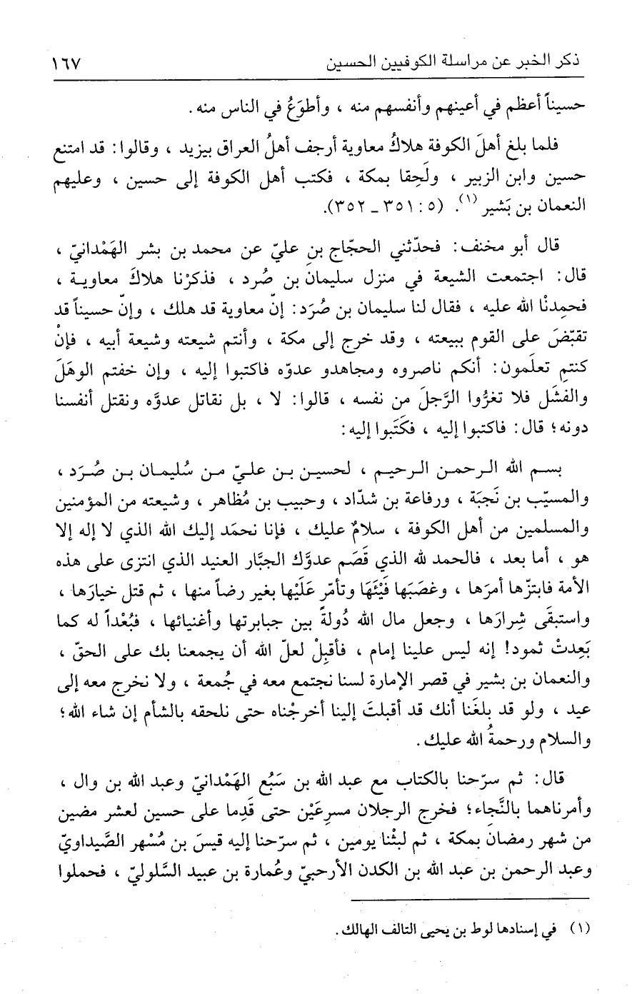 قال أبو مخنف: فحدّثني الحجّاج بنِ عليّ عن محمد بن بشر الهَمْدانيّ، قال: اجتمعت الشيعة في منزل سليمان بن صُرد، فذكرْنا هلاكَ معاوية، فحمِدنْا الله عليه، فقال لنا سليمان بن صُرَد: إنّ معاوية قد هلك، وإنّ حسينًا قد تقتضَ على القوم ببيعته، وقد خرج إلى مكة، وأنتم شيعته وشيعة أبيه، فإنْ كنتمِ تعلَمون: أنكم ناصروه ومجاهدو عدوّه فاكتبوا إليه، وإن خفتم الوهَلَ والفشَل فلا تغرُّوا الرَّجلَ من نفسه، قالوا: لا، بل نقاتل عدوَّه ونقتل أنفسنا دونه؛ قال: فاكتبوا إليه، فكَتَبوا إليه: