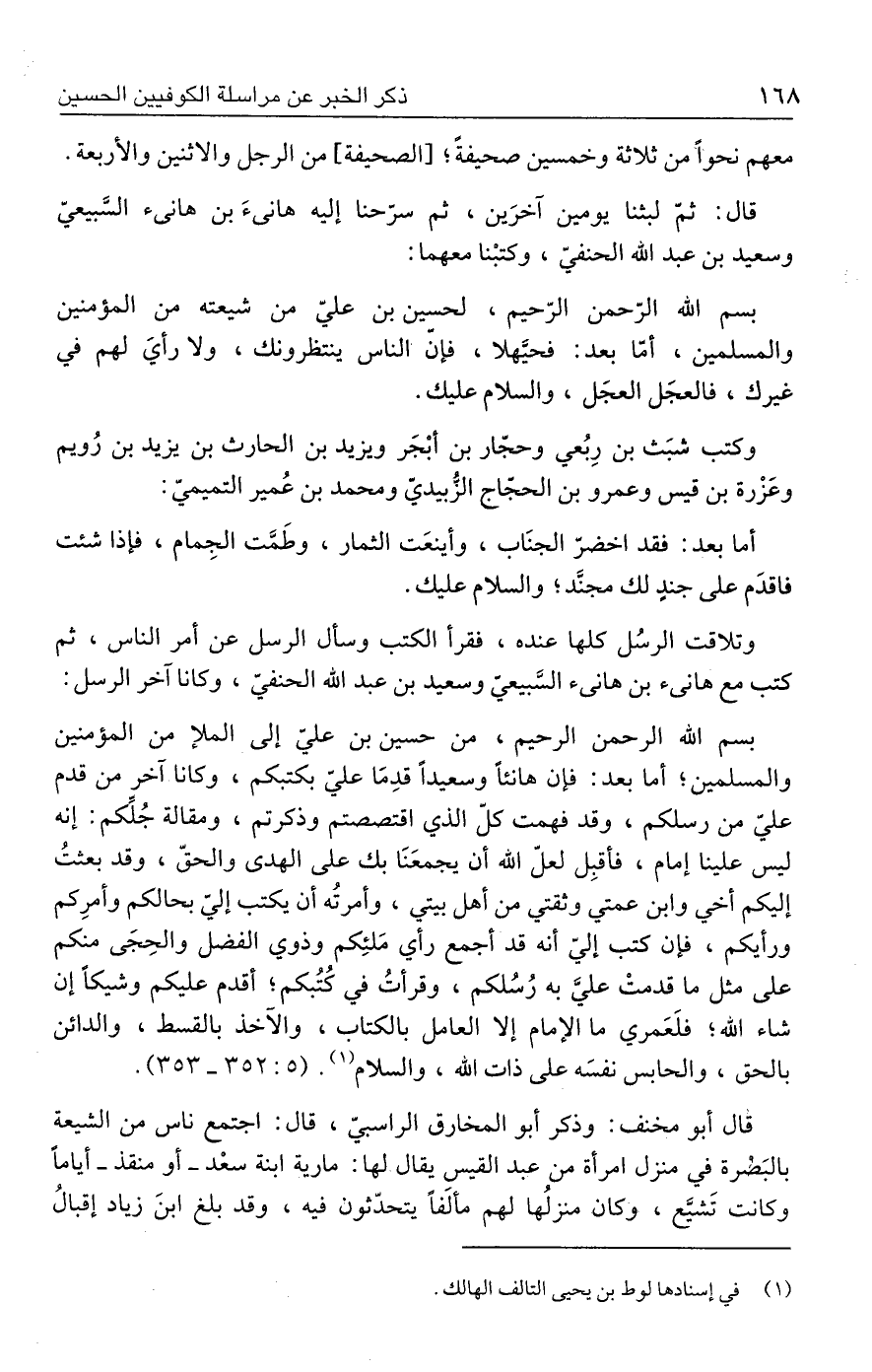 بسم الله الرحمن الرحيم، من حسين بن على إلى الملإ من المؤمنين والمسلمين؛ أما بعد: فإن هانئًا وسعيدًا قدِمَا عليّ بكتبكم، وكانا آخر من قدم عليّ من رسلكم، وقد فهمت كلّ الذي اقتصصتم وذكرتم، ومقالة جُلِّكم: إنه ليس علينا إمام، فأقبِل لعلّ الله أن يجمعَنَا بك على الهدى والحقّ، وقد بعثتُ إليكم أخي وابن عمتي وثقتي من أهل بيتي، وأمرتُه أن يكتب إليّ بحالكم وأمرِكم ورأيكم، فإن كتب إليّ أنه قد أجمع رأي مَلئِكم وذوي الفضل والحِجَى منكم على مثل ما قدمتْ عليَّ به رُسُلكم، وقرأتُ في كُتُبكم؛ أقدم عليكم وشيكًا إن شاء الله؛ فلَعَمري ما الإمام إلا العامل بالكتاب، والآخذ بالقسط، والدائن بالحق، والحابس نفسَه على ذات الله، والسلام (١). (٥: ٣٥٢ - ٣٥٣).