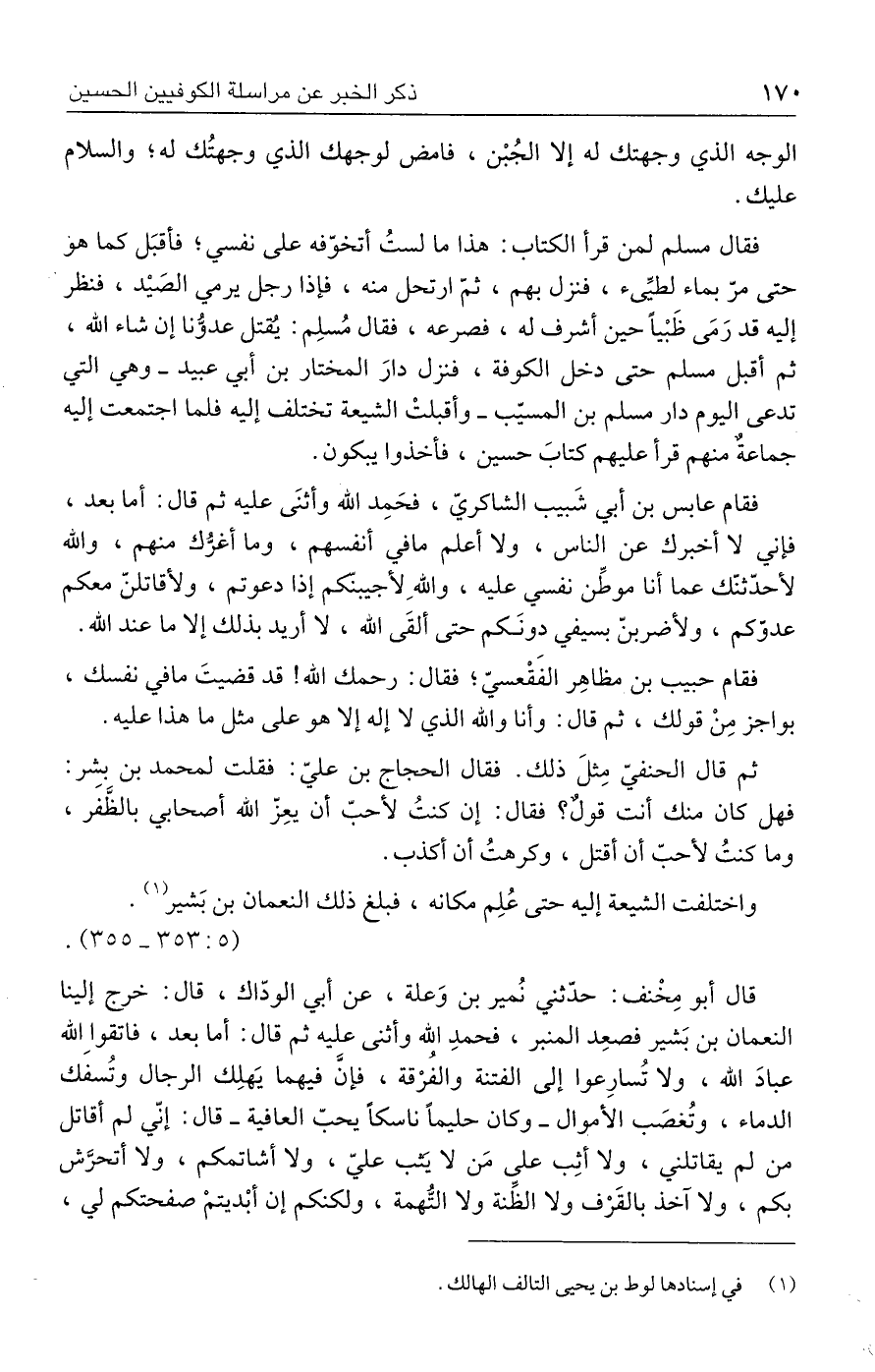 فقال مسلم لمن قرأ الكتاب: هذا ما لستُ أتخوّفه على نفسي؛ فأقبَل كما هو حتى مرّ بماء لطيِّئ، فنزل بهم، ثمّ ارتحل منه، فإذا رجل يرمي الصَيْد، فنظرْ إليه قد رَمَى ظَبْيًا حين أشرف له، فصرعه، فقال مُسلِم: يُقتل عدوُّنا إن شاء الله، ثم أقبل مسلم حتى دخل الكوفة، فنزل دارَ المختار بن أبي عبيد -وهي التي تدعى اليوم دار مسلم بن المسيّب- وأقبلتْ الشيعة تختلف إليه فلما اجتمعت إليه جماعةٌ منهم قرأ عليهم كتابَ حسين، فأخذوا يبكون.