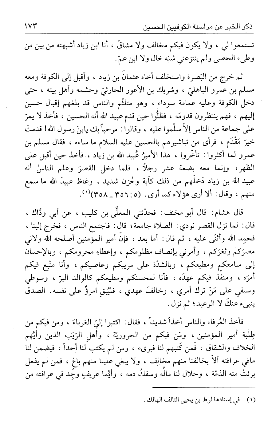 قال هشام: قال أبو مخنف: فحدّثني المعلَّى بن كليب، عن أبي ودَّاك، قال: لما نزل القصر نودي: الصلاة جامعة، قال: فاجتمع الناس، فخرج إلينا، فحمِد الله وأثنَى عليه، ثم قال: أما بعد، فإنّ أمير المؤمنين أصلحه الله ولاني مصرَكم وثغرَكم، وأمرني بإنصاف مظلومكم، وإعطاءِ محرومكم، وبالإحسان إلى سامعكم رمطيعكم، وبالشدّة على مريبكم وعاصيكم، وأنا متّبع فيكم أمرَه، ومنفّذ فيكم عهدَه، فأنا لمحسنكم ومطيعكم كالوالد البرّ، وسوطي وسيفي على مَنْ ترك أمري، وخالفَ عهدي، فليُبقِ امرؤٌ على نفسه. الصدق ينبئ عنكَ لا الوعيد؛ ثم نزل.