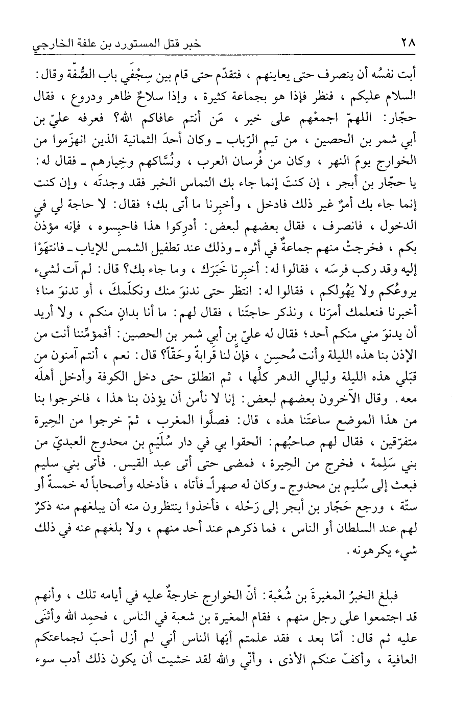 أبت نفسُه أن ينصرف حتى يعاينهم، فتقدّم حتى قام بين سِجْفَي باب الصُّفّة وقال: السلام عليكم، فنظر فإذا هو بجماعة كثيرة، وإذا سلاحٌ ظاهر ودروع، فقال حجّار: اللهمّ اجمعْهم على خير، مَن أنتم عافاكم الله؟ فعرفه عليّ بن أبي شمر بن الحصين، من تيم الرّباب - وكان أحدَ الثمانية الذين انهزَموا من الخوارج يومَ النهر، وكان من فُرسان العرب، ونُسَّاكهم وخِيارهم - فقال له: يا حجّار بن أبجر، إن كنتَ إنما جاء بك التماس الخبر فقد وجدتَه، وإن كنت إنما جاء بك أمرٌ غير ذلك فادخل، وأخبِرنا ما أتى بك؛ فقال: لا حاجة لي في الدخول، فانصرف، فقال بعضهم لبعض: أدرِكوا هذا فاحبِسوه، فإنه مؤذنٌ بكم، فخرجتْ منهم جماعةٌ في أثره - وذلك عند تطفيل الشمس للإياب - فانتهَوْا إليه وقد ركب فرسَه، فقالوا له: أخبِرنا خَبَرَك، وما جاء بك؟ قال: لم آت لشيء يروعُكم ولا يَهُولكم، فقالوا له: انتظر حتى ندنوَ منك ونكلّمكَ، أو تدنوَ منا؛ أخبرنا فنعلمك أمرَنا، ونذكر حاجتَنا، فقال لهم: ما أنا بدانٍ منكم، ولا أريد أن يدنوَ مني منكم أحد؛ فقال له عليّ ين أبي شمر بن الحصين: أفمؤمَّننا أنت من الإذن بنا هذه الليلة وأنت مُحسِن، فإنَّ لنا قَرابةً وحَقًّا؟ قال: نعم، أنتم آمنون من قبَلي هذه الليلة وليالي الدهر كلِّها، ثم انطلق حتى دخل الكوفة وأدخل أهلَه معه. وقال الآخرون بعضهم لبعض: إنا لا نأمن أن يؤذن بنا هذا، فاخرجوا بنا من هذا الموضع ساعتَنا هذه، قال: فصلَّوا المغرب، ثمّ خرجوا لمن الحِيرة متفرّقين، فقال لهم صاحبُهم: الحقوا بي في دار سُلَيْمِ بن محدوج العبديّ من بني سَلِمة، فخرج من الحِيرة، فمضى حتى أتى عبد القيس. فأتى بني سليم فبعث إلى سُليم بن محدوج - وكان له صهرًا - فأتاه، فأدخله وأصحابًا له خمسةً أو ستّة، ورجع حَجّار بن أبجر إلى رَحْله، فأخذوا ينتظرون منه أن يبلغهم منه ذكرٌ لهم عند السلطان أو الناس، فما ذكرهم عند أحد منهم، ولا بلغهم عنه في ذلك شيء يكرهونه.