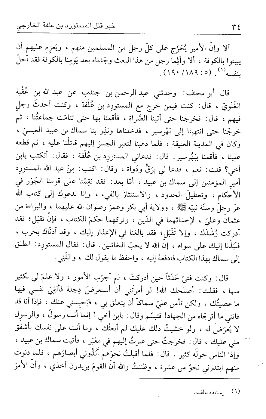قال أبو مخنف: وحدثني عبد الرحمن بن جندب عن عبد الله بن عُقْبة الغَنَويّ، قال: كنت فيمن خرج مع المستورِد بن عُلّفة، وكنت أحدثَ رجلٍ فيهم، قال: فخرجنا حتى أتينا الصَّراة، فأقمنا بها حتى تتامّت جماعتُنا، ثم خرجْنا حتى انتهينا إلى بَهْرسير، فدخلناها ونذِر بنا سماك بن عبيد العبسيّ، وكان في المدينة العتيقة، فلما ذهبنا لنعبر الجسرَ إليهم قاتلْنا عليه، ثم قطعه علينا، فأقمنا ببَهُرسير. قال: فدعاني المستورِد بن عُلّفة، فقال: أتكتب يابن أخي؟ قلت: نعم، فدعا لي برَقٍّ ودَواة، وقال: اكتب: مِنْ عبد الله المستورِد أميرِ المؤمنين إلى سماك بن عبيد، أمّا بعد: فقد نقِمْنا على قومنا الجَوْر في الأحكام، وتعطيلَ الحدود، والاستئثارَ بالفيء، وإنا ندعوك إلى كتاب الله عزّ وجلّ وسنّة نبيّه - صلى الله عليه وسلم -، وولاية أبي بكر وعمرَ رضوان الله عليهما، والبراءة من عثمانَ وعليّ، لإحداثهما في الدّين، وتركهما حكمَ الكتاب، فإنْ تقبَل؛ فقد أدركت رُشْدَك، وإلا تَقْبَل؛ فقد بالغنا في الإعذار إليك، وقد آذنّاك بحرب، فنَبَذْنا إليك على سواء، إنّ الله لا يحبّ الخائنين. قال: فقال المستورِد: انطلق إلى سماك بهذا الكتاب فادفعهُ إليه، واحفظ ما يقول لك، والقَنِي.