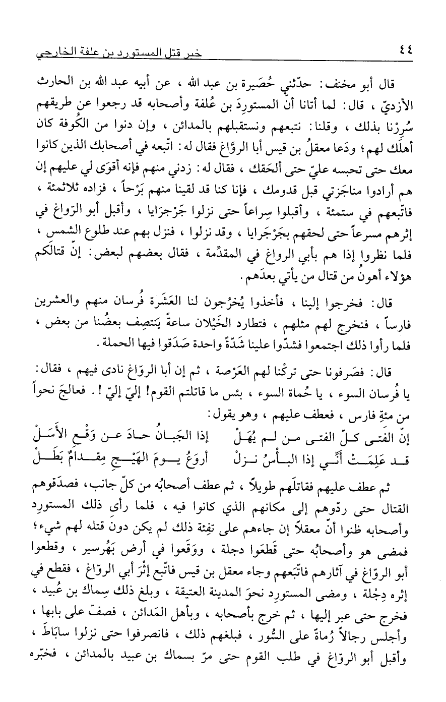 قال: فخرجوا إلينا، فأخذوا يُخرُجون لنا العَشَرة فُرسان منهم والعشرين فارسًا، فنخرج لهم مثلهم، فتطارد الخَيْلان ساعةً يَنتصِف بعضُنا من بعض، فلما رأوا ذلك اجتمعوا فشدّوا علينا شَدّةً واحدة صَدَقوا فيها الحملة.