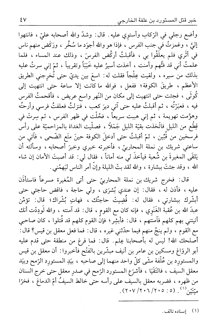 وأضع رجلي في الرّكاب وأستوِي عليه. قال: وشدّ والله أصحابه عليّ، فانتهوا إليَّ، وغمزتُ في جنب الفرس، فإذا هو والله أجوَد ما سُخِّر، ورَكَض منهم ناس في أثَري فلم يعلَقُوا بي، فأقبلتُ أركُض الفرسَ، وذلك عند المساء، فلما علمتُ أني قد فتُّهم وأمنت، أخذت أسيرُ عليه خَبَبًا وتقريبًا، ثمّ إني سرتُ عليه بذلك من سيره، ولقيت عِلْجًا فقلت له: اسعَ بين يديّ حتى تُخرِجني الطريق الأعظم، طريقَ الكوفة؛ ففعل، فوالله ما كانت إلا ساعة حتى انتهيت إلى كُوثَى، فجئت حتى انتهيت إلى مكان من النّهر واسع عريض، فأقحمتُ الفرس فيه، فعبَرْتُه، ثم أقبلتُ عليه حتى آتي ديرَ كعب، فنزلتُ فعلفتُ فرسي وأرحتُه وهوَّمت تهويمة، ثم إني هببت سريعًا، فحُلْت في ظهر الفرس، ثم سِرتْ في قِطْع من الليل فاتّخذت بقيّة الليل جَمَلًا، فصلّيت الغداة بالمزاحميّة على رأس فرسخين من قُبِّين، ثمّ أقبلتُ حتى أدخلَ الكوفة حينَ متَع الضّحى، فآتي من ساعتي شريك بن نملة المحاربيّ، فأخبرته خبري وخبرَ أصحابه، وسألته أن يَلقَى المغيرةَ بن شُعبة فيأخذَ لي منه أمانًا، فقال لي: قد أصبتَ الأمان إن شاء الله، وقد جئتَ ببشارة، والله لقد بتّ الليلة وإنّ أمر الناس ليَهمّني.