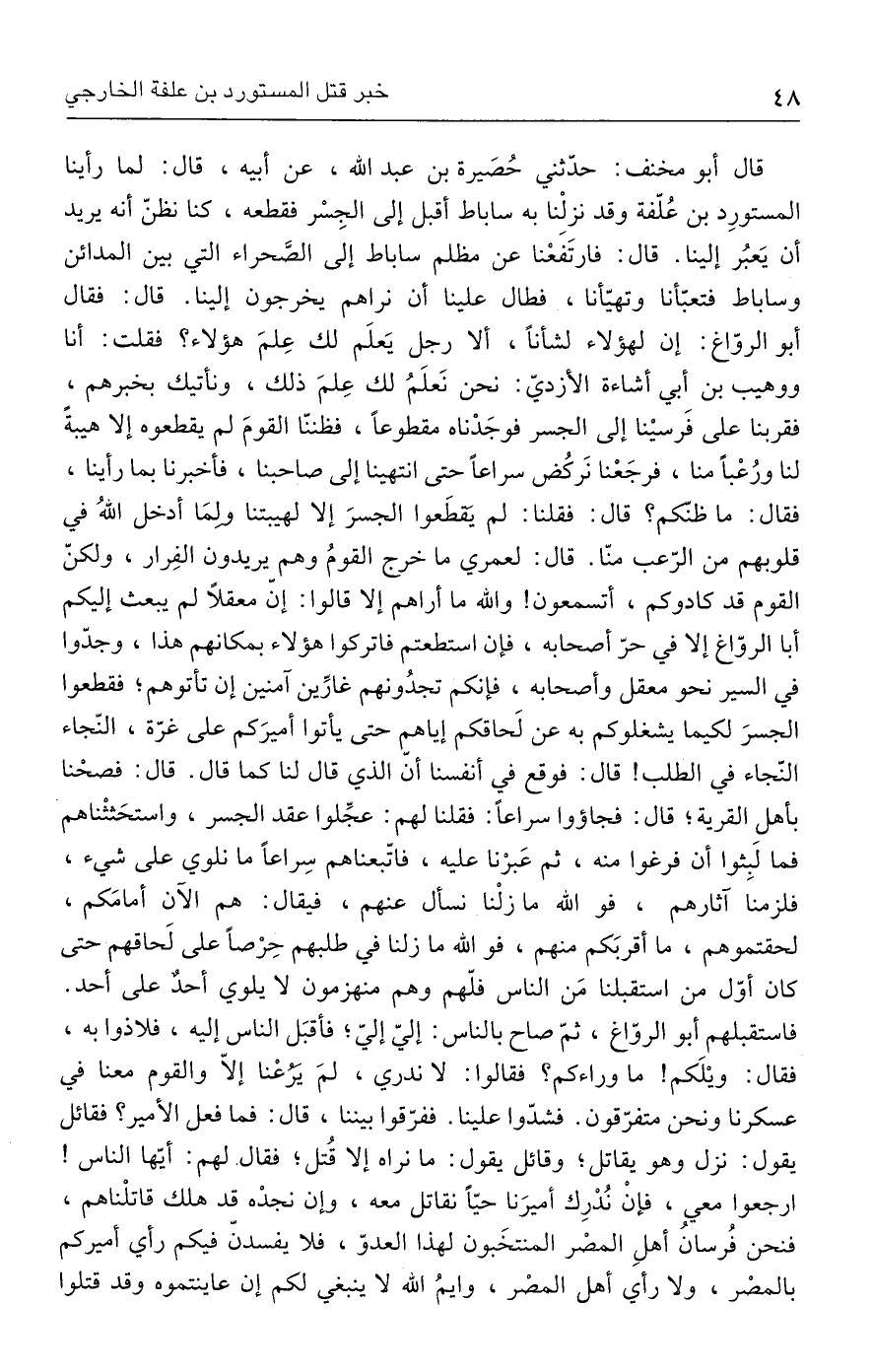 قال أبو مخنف: حدّثني حُصَيرة بن عبد الله، عن أبيه، قال: لما رأينا المستورِد بن عُلّفة وقد نزلْنا به ساباط أقبل إلى الجِسْر فقطعه، كنا نظنّ أنه يريد أن يَعبُر إلينا. قال: فارتَفَعْنا عن مظلم ساباط إلى الصَّحراء التي بين المدائن وساباط فتعبّأنا وتهيّأنا، فطال علينا أن نراهم يخرجون إلينا. قال: فقال أبو الروّاغ: إن لهؤلاء لشأنًا، ألا رجل يَعلَم لك عِلمَ هؤلاء؟ فقلت: أنا ووهيب بن أبي أشاءة الأزديّ: نحن نَعلَمُ لك عِلمَ ذلك، ونأتيك بخبرهم، فقربنا على فَرسيْنا إلى الجسر فوجَدْناه مقطوعًا، فظننّا القومَ لم يقطعوه إلا هيبةً لنا ورُعْبًا منا، فرجَعْنا نَركُض سراعًا حتى انتهينا إلى صاحبنا، فأخبرنا بما رأينا، فقال: ما ظنّكم؟ قال: فقلنا: لم يَقطَعوا الجسرَ إلا لهيبتنا ولِمَا أدخل اللهُ في قلوبهم من الرّعب منّا. قال: لعمري ما خرج القومُ وهم يريدون الفِرار، ولكنّ القوم قد كادوكم، أتسمعون! والله ما أراهم إلا قالوا: إنّ معقلًا لم يبعث إليكم أبا الروّاغ إلا في حرّ أصحابه، فإن استطعتم فاتركوا هؤلاء بمكانهم هذا، وجدّوا في السير نحو معقل وأصحابه، فإنكم تجدُونهم غارِّين آمنين إن تأتوهم؛ فقطعوا الجسرَ لكيما يشغلوكم به عن لَحاقكم إياهم حتى يأتوا أميرَكم على غرّة، النّجاء النّجاء في الطلب! قال: فوقع في أنفسنا أنّ الذي قال لنا كما قال. قال: فصحْنا بأهل القرية؛ قال: فجاؤوا سراعًا: فقلنا لهم: عجِّلوا عقد الجسر، واستحَثثْناهم فما لَبِثوا أن فرغوا منه، ثم عَبرْنا عليه، فاتّبعناهم سِراعًا ما نلوي على شيء، فلزمنا آثارهم، فو الله ما زلْنا نسأل عنهم، فيقال: هم الآن أمامَكم، لحقتموهم، ما أقربَكم منهم، فو الله ما زلنا في طلبهم حِرْصًا على لَحاقهم حتى كان أوّل من استقبلنا مَن الناس فلّهم وهم منهزمون لا يلوي أحدٌ على أحد. فاستقبلهم أبو الروّاغ، ثمّ صاح بالناس: إليّ إليّ؛ فأقبَل الناس إليه، فلاذوا به، فقال: ويْلَكم! ما وراءكم؟ فقالوا: لا ندري، لمَ يَرُعْنا إلّا والقوم معنا في عسكرنا ونحن متفرّقون. فشدّوا علينا. ففرّقوا بيننا، قال: فما فعل الأمير؟ فقائل يقول: نزل وهو يقاتل؛ وقائل يقول: ما نراه إلا قُتل؛ فقال لهم: أيّها الناس! ارجعوا معي، فإنْ نُدْرِك أميرَنا حيًّا نقاتل معه، وإن نجدْه قد هلك قاتلْناهم، فنحن فُرسانُ أهلِ المصْر المنتخَبون لهذا العدوّ، فلا يفسدنّ فيكم رأي أميركم بالمصْر، ولا رأي أهل المصْر، وايمُ الله لا ينبغي لكم إن عاينتموه وقد قتلوا