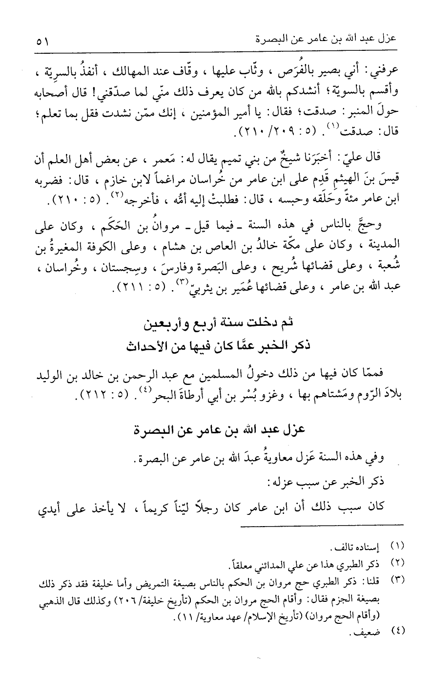 (٣) قلنا: ذكر الطبري حج مروان بن الحكم بالناس بصيغة التمريض وأما خليفة فقد ذكر ذلك بصيغة الجزم فقال: وأقام الحج مروان بن الحكم (تأريخ خليفة/ ٢٠٦) وكذلك قال الذهبي (وأقام الحج مروان) (تأريخ الإسلام/ عهد معاوية/ ١١).