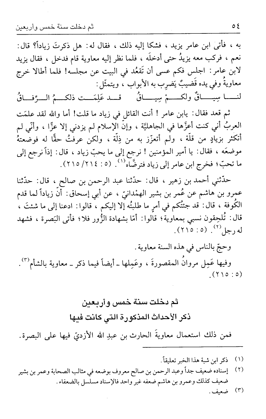 حدّثني أحمد بن زهير، قال: حدّثنا عبد الرحمن بن صالح، قال: حدّثنا عمرو بن هاشم عن عُمر بن بشير الهمْدانيّ، عن أبي إسحاق: أنّ زيادًا لما قدم الكُوفة، قال: قد جئتُكم في أمرٍ ما طلبتُه إلا إليكم، قالوا: ادعنا إلى ما شئتَ، قال: تُلحِقون نسبي بمعاوية؛ قالوا: أمّا بشهادة الزُّور فلا؛ فأتى البَصرة، فشهد له رجل (٢). (٥: ٢١٥).
