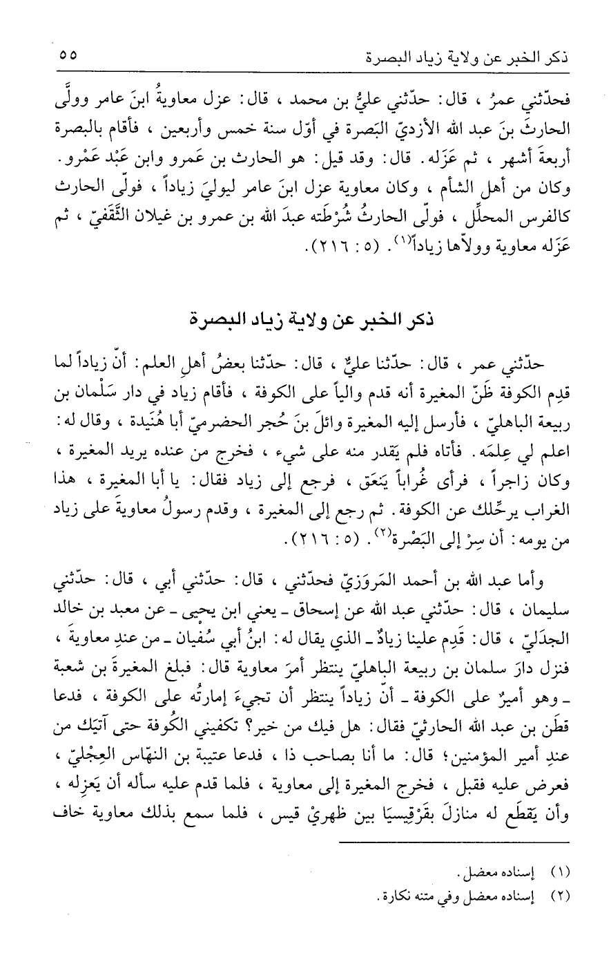 وأما عبد الله بن أحمد المَروَزيّ فحدّثني، قال: حدّثني أبي، قال: حدّثني سليمان، قال: حدّثني عبد الله عن إسحاق - يعني ابن يحيى - عن معبد بن خالد الجدَليّ، قال: قَدِم علينا زيادٌ - الذي يقال له: ابنُ أبي سُفْيان - من عندِ معاويةَ، فنزل دارَ سلمان بن ربيعة الباهليّ ينتظر أمرَ معاوية قال: فبلغ المغيرةَ بن شعبة - وهو أميرٌ على الكوفة - أنّ زيادًا ينتظر أن تجيءَ إمارتُه على الكوفة، فدعا قطَن بن عبد الله الحارثيّ فقال: هل فيك من خير؟ تكفيني الكُوفة حتى آتيَك من عندِ أمير المؤمنين؛ قال: ما أنا بصاحب ذا، فدعا عتيبة بن النهّاس العِجْليّ، فعرض عليه فقبل، فخرج المغيرة إلى معاوية، فلما قدم عليه سأله أن يَعزِله، وأن يَقطَع له منازلَ بقَرْقِيسيَا بين ظهريْ قيس، فلما سمع بذلك معاوية خاف