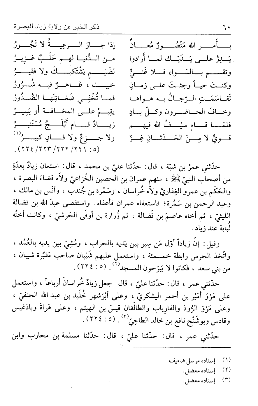 حدّثني عمر، قال: حدّثنا عليّ، قال: جعل زيادٌ خُراسانَ أرباعًا، واستعمل على مَرْوَ أمَيْر بن أحمر اليشكريّ، وعلى أبْرَشهر خُلَيد بن عبد الله الحنفيّ، وعلى مَرْوَ الرُّوذ والفارِياب والطالَقان قيسَ بن الهيثم، وعلى هَراةَ وباذغيس وقادس وبوشَنْج نافع بن خالد الطاحِيّ (٣). (٥: ٢٢٤).