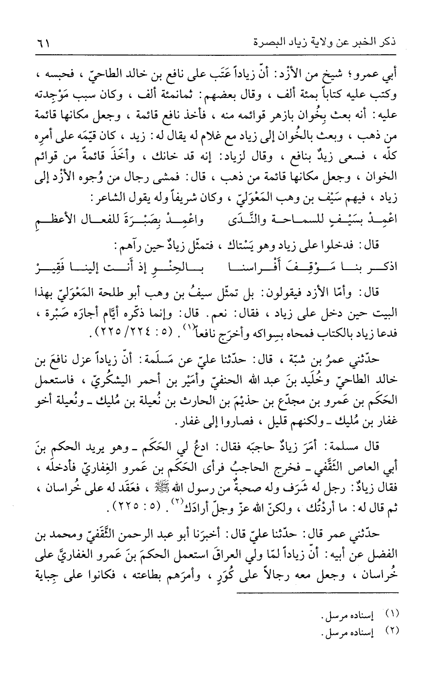 حدّثني عمر قال: حدّثنا عليّ قال: أخبرَنا أبو عبد الرحمن الثَّقَفيّ ومحمد بن الفضل عن أبيه: أنّ زيادًا لمّا ولي العراقَ استعمل الحكمَ بنَ عَمرو الغفاريَّ على خُراسان، وجعل معه رجالًا على كُوَرٍ، وأمرَهم بطاعته، فكانوا على جِباية