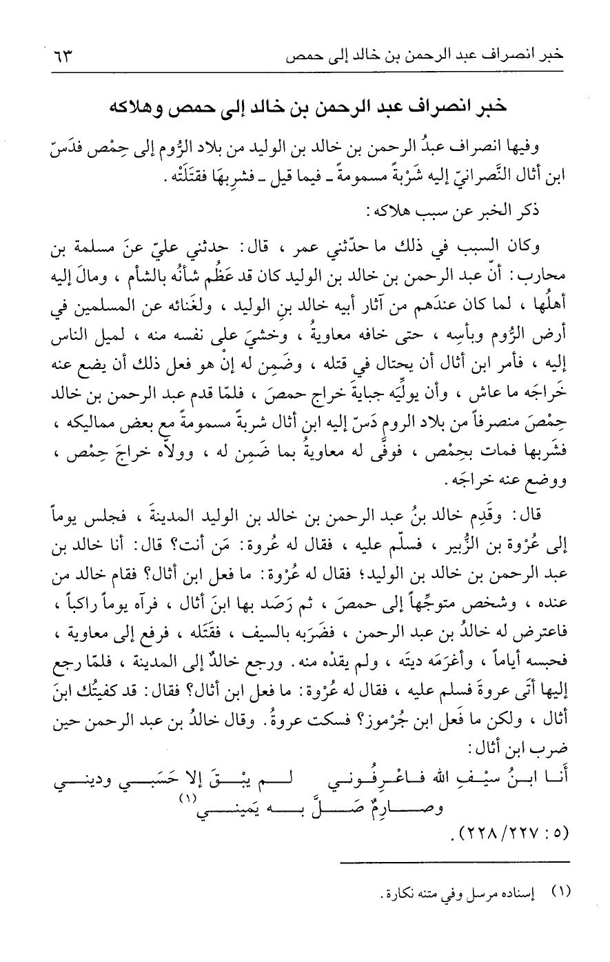 خبر انصراف عبد الرحمن بن خالد إلى حمص وهلاكه