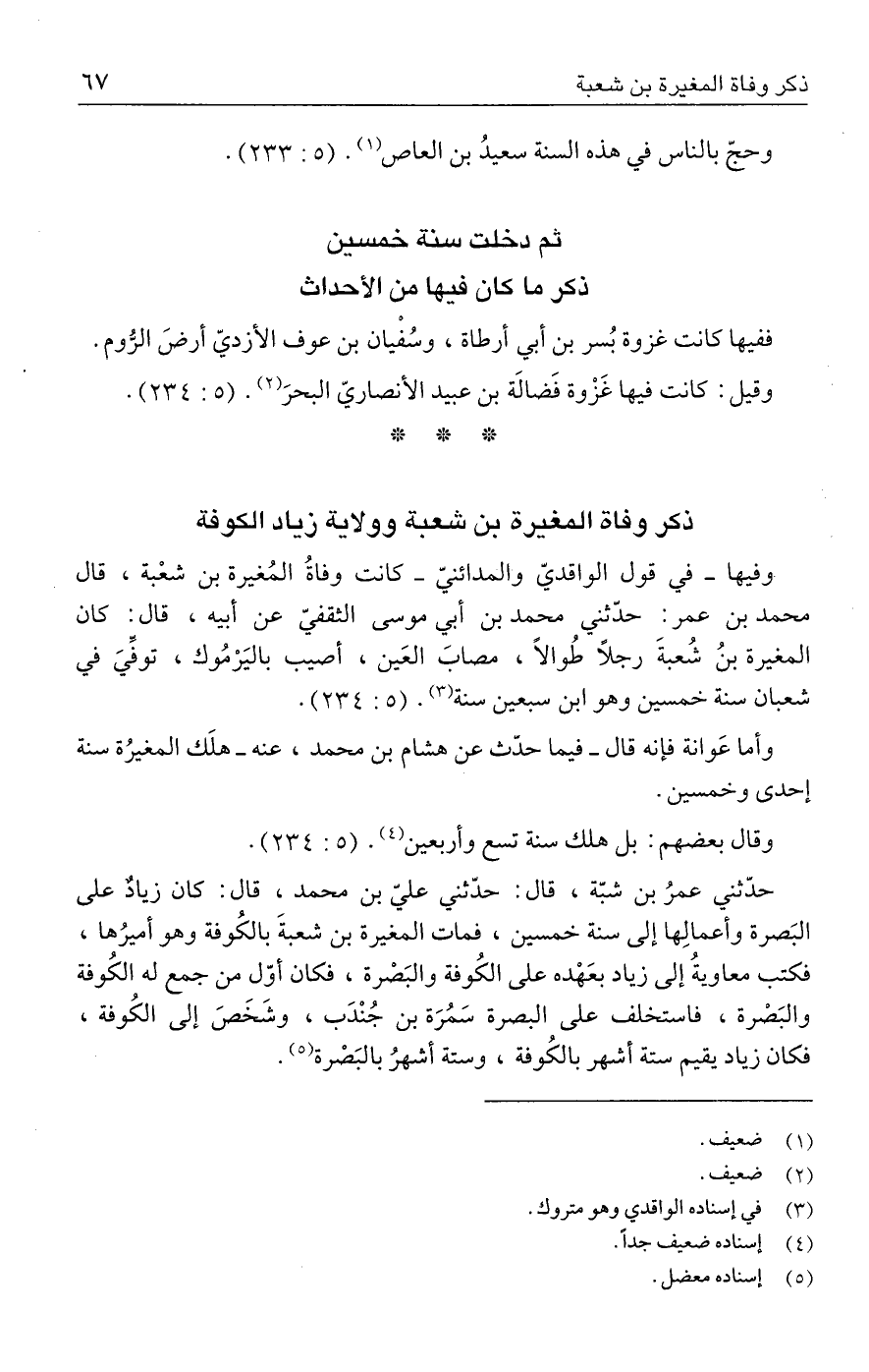 وفيها - في قول الواقديّ والمدائنيّ - كانت وفاةُ المُغيرة بن شعْبة، قال محمد بن عمر: حدّثني محمد بن أبي موسى الثقفيّ عن أبيه، قال: كان المغيرة بنُ شُعبةَ رجلًا طُوالًا، مصابَ العَين، أصيب باليَرْمُوك، توفِّيَ في شعبان سنة خمسين وهو ابن سبعين سنة (٣). (٥: ٢٣٤).