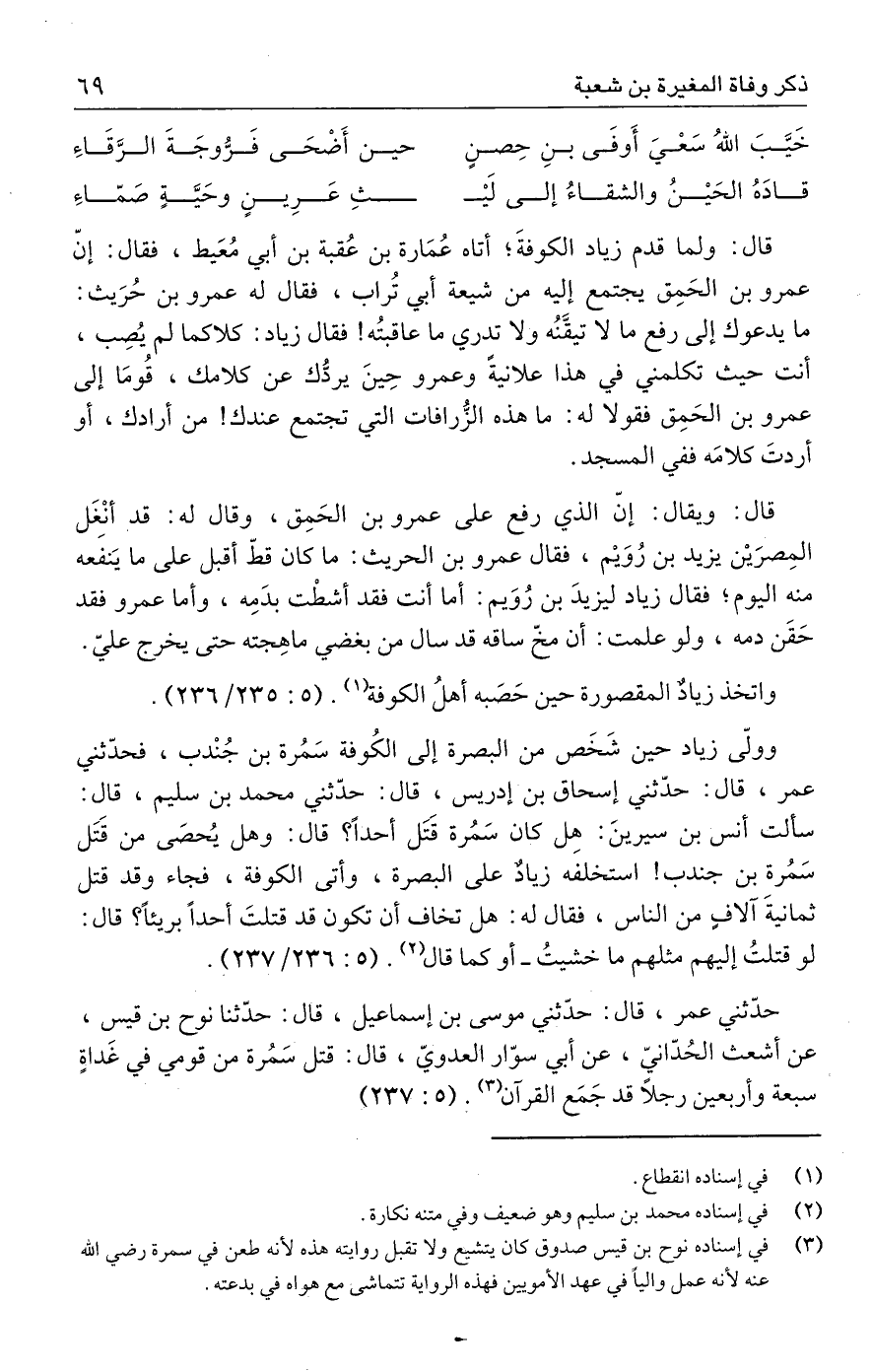 (٣) في إسناده نوح بن قيس صدوق كان يتشيع ولا تقبل روايته هذه لأنه طعن في سمرة رضي الله عنه لأنه عمل واليًا في عهد الأمويين فهذه الرواية تتماشى مع هواه في بدعته.