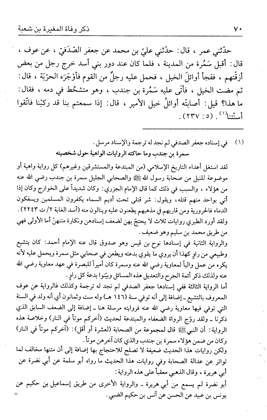 حدّثني عمر، قال: حدّثني عليّ بن محمد عن جعفر الصّدَفيّ، عن عوف، قال: أقبل سَمُرة من المدينة، فلما كان عند دور بني أسد خرج رجل من بعض أزقّتهم، ففجأ أوائلَ الخيل، فحمل عليه رجلٌ من القوم فأوْجَرَه الحرْبَة، قال: ثم مضت الخيل، فأتَى عليه سَمُرة بن جندب، وهو متشحِّط في دمه، فقال: ما هذا؟ قيل: أصابتْه أوائلُ خيل الأمير، قال: إذا سمعتم بنا قد ركبْنا فاتّقوا أسنّتنا (١). (٥: ٢٣٧).