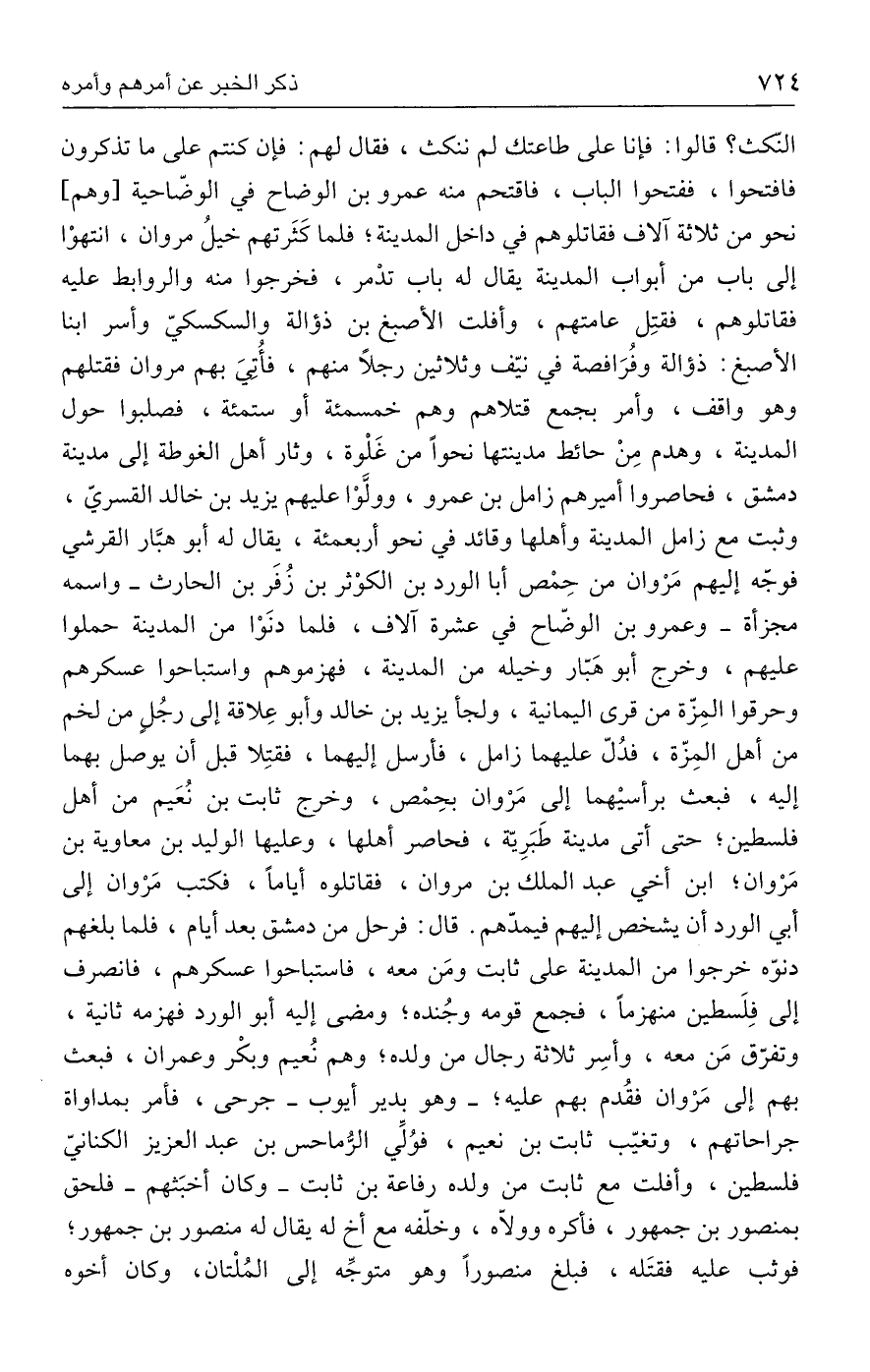 النكث؟ قالوا: فإنا على طاعتك لم ننكث، فقال لهم: فإن كنتم على ما تذكرون فافتحوا، ففتحوا الباب، فاقتحم منه عمرو بن الوضاح في الوضّاحية [وهم] نحو من ثلاثة آلاف فقاتلوهم في داخل المدينة؛ فلما كَثَرتهم خيلُ مروان، انتهوْا إلى باب من أبواب المدينة يقال له باب تدْمر، فخرجوا منه والروابط عليه فقاتلوهم، فقتِل عامتهم، وأفلت الأصبغ بن ذؤالة والسكسكيّ وأسر ابنا الأصبغ: ذؤالة وفُرَافصة في نيّف وثلاثين رجلًا منهم، فأُتِيَ بهم مروان فقتلهم وهو واقف، وأمر بجمع قتلاهم وهم خمسمئة أو ستمئة، فصلبوا حول المدينة، وهدم مِنْ حائط مدينتها نحوًا من غَلْوة، وثار أهل الغوطة إلى مدينة دمشق، فحاصروا أميرهم زامل بن عمرو، وولَّوْا عليهم يزيد بن خالد القسريّ، وثبت مع زامل المدينة وأهلها وقائد في نحو أربعمئة، يقال له أبو هبَّار القرشي فوجّه إليهم مَرْوان من حِمْص أبا الورد بن الكوْثر بن زُفَر بن الحارث - واسمه مجزأة - وعمرو بن الوضّاح في عشرة آلاف، فلما دنَوْا من المدينة حملوا عليهم، وخرج أبو هَبّار وخيله من المدينة، فهزموهم واستباحوا عسكرهم وحرقوا المِزّة من قرى اليمانية، ولجأ يزيد بن خالد وأبو عِلاقة إلى رجُلٍ من لخم من أهل المِزّة، فدُلّ عليهما زامل، فأرسل إليهما، فقتِلا قبل أن يوصل بهما إليه، فبعث برأسيْهما إلى مَرْوان بحِمْص، وخرج ثابت بن نُعَيم من أهل فلسطين؛ حتى أتى مدينة طَبَرِيّة، فحاصر أهلها، وعليها الوليد بن معاوية بن مَرْوان؛ ابن أخي عبد الملك بن مروان، فقاتلوه أيامًا، فكتب مَرْوان إلى أبي الورد أن يشخص إليهم فيمدّهم. قال: فرحل من دمشق بعد أيام، فلما بلغهم دنوّه خرجوا من المدينة على ثابت ومَن معه، فاستباحوا عسكرهم، فانصرف إلى فِلَسطين منهزمًا، فجمع قومه وجُنده؛ ومضى إليه أبو الورد فهزمه ثانية، وتفرّق مَن معه، وأسِر ثلاثة رجال من ولده؛ وهم نُعيم وبكْر وعمران، فبعث بهم إلى مَرْوان فقُدم بهم عليه؛ - وهو بدير أيوب - جرحى، فأمر بمداواة جراحاتهم، وتغيّب ثابت بن نعيم، فوُلِّي الرُّماحس بن عبد العزيز الكنانيّ فلسطين، وأفلت مع ثابت من ولده رفاعة بن ثابت - وكان أخبَثهم - فلحق بمنصور بن جمهور، فأكره وولّاه، وخلّفه مع أخ له يقال له منصور بن جمهور؛ فوثب عليه فقتَله، فبلغ منصورًا وهو متوجِّه إلى المُلْتان، وكان أخوه