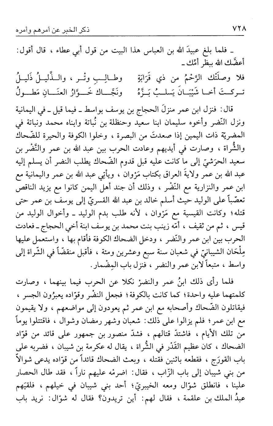 قال: فنزل ابن عمر منزلَ الحجاج بن يوسف بواسط - فيما قيل - في اليمانية ونزل النّضر وأخوه سليمان ابنا سعيد وحنظلة بن نُباتة وابناه محمد ونباتة في المضريّة ذات اليمين إذا صعدتَ من البصرة، وخلوا الكوفة والحيرة للضّحاك والشُّراة، وصارت في أيديهم وعادت الحرب بين عبد الله بن عمر والنَّضْر بن سعيد الحرَشيّ إلى ما كانت عليه قبل قدوم الضّحاك يطلب النضر أن يسلم إليه عبد الله بن عمر ولايةَ العراق بكتاب مَرْوان، ويأتِي عبد الله بن عمر واليمانية مع ابن عمر والنزارية مع النّضْر، وذلك أن جند أهل اليمن كانوا مع يزيد الناقص تعصّبًا على الوليد حيث أسلم خالد بن عبد الله القسريّ إلى يوسف بن عمر حتى قتله؛ وكانت القيسية مع مَرْوان، لأنه طلب بدم الوليد - وأخوال الوليد من قيس، ثم من ثقيف، أمّه زينب بنت محمد بن يوسف ابنة أخي الحجاج - فعادت الحرب بين ابن عمر والنّضر، ودخل الضحاك الكوفة فأقام بها، واستعمل عليها مِلْحَان الشيبانيّ في شعبان سنة سبع وعشرين ومئة، فأقبل منقضًّا في الشّراة إلى واسط، متبعًا لابن عمر والنضر، فنزل باب المِضْمار.