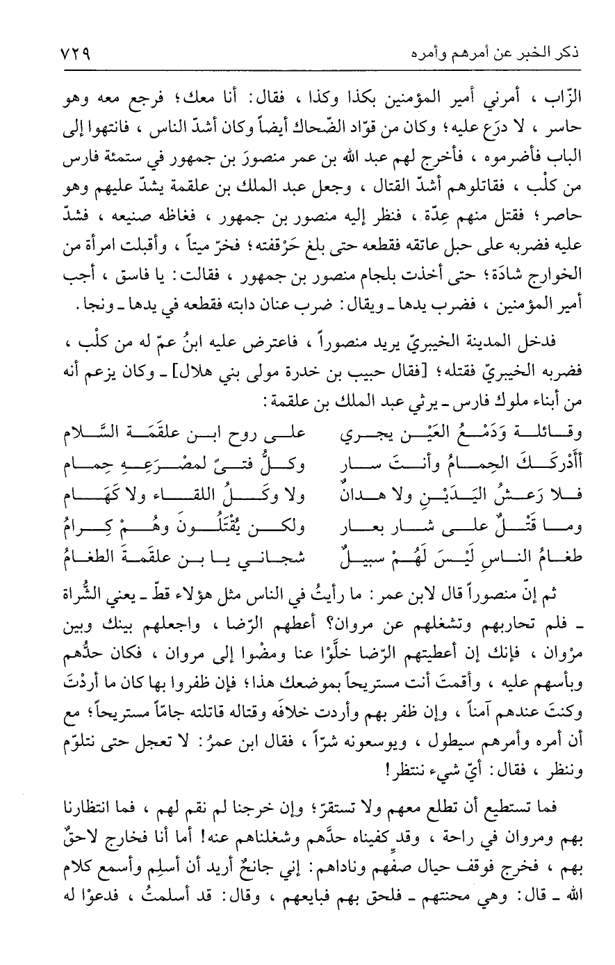 الزّاب، أمرني أمير المؤمنين بكذا وكذا، فقال: أنا معك؛ فرجع معه وهو حاسر، لا درَع عليه؛ وكان من قوّاد الضّحاك أيضًا وكان أشدّ الناس، فانتهوا إلى الباب فأضرموه، فأخرج لهم عبد الله بن عمر منصورَ بن جمهور في ستمئة فارس من كلْب، فقاتلوهم أشدّ القتال، وجعل عبد الملك بن علقمة يشدّ عليهم وهو حاصر؛ فقتل منهم عِدّة، فنظر إليه منصور بن جمهور، فغاظه صنيعه، فشدّ عليه فضربه على حبل عاتقه فقطعه حتى بلغ حَرْقفته؛ فخرّ ميتًا، وأقبلت امرأة من الخوارج شادَة؛ حتى أخذت بلجام منصور بن جمهور، فقالت: يا فاسق، أجب أمير المؤمنين، فضرب يدها - ويقال: ضرب عنان دابته فقطعه في يدها - ونجا.