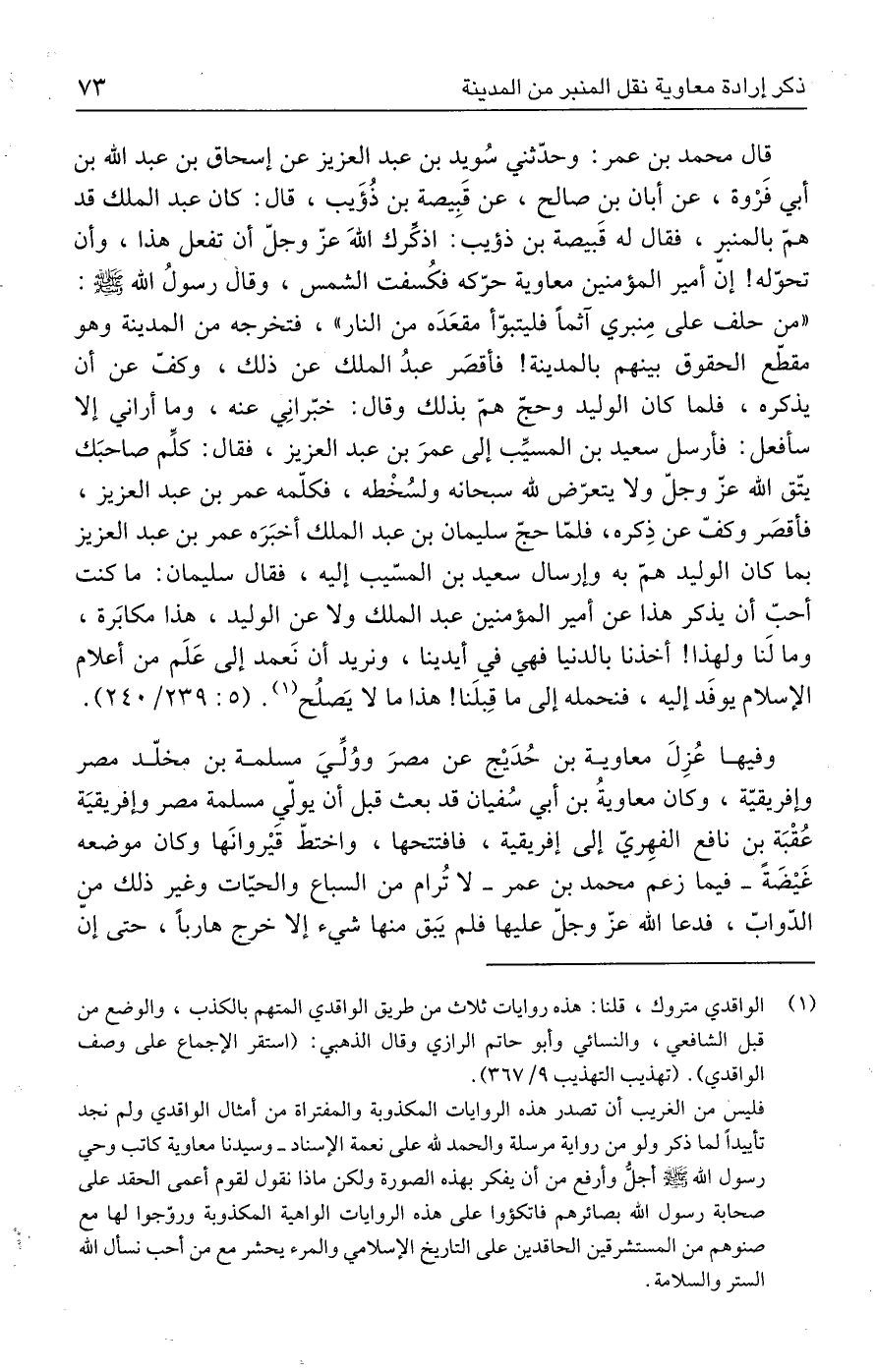 قال محمد بن عمر: وحدّثني سُويد بن عبد العزيز عن إسحاق بن عبد الله بن أبي فَرْوة، عن أبان بن صالح، عن قبِيصة بن ذُؤَيب، قال: كان عبد الملك قد همّ بالمنبر، فقال له قَبيصة بن ذؤيب: اذكِّرك اللهَ عزّ وجلّ أن تفعل هذا، وأن تحوّله! إنّ أمير المؤمنين معاوية حرّكه فكُسفت الشمس، وقال رسولُ الله - صلى الله عليه وسلم -: "من حلف على مِنبري آثمًا فليتبوّأ مقعَدَه من النار"، فتخرجه من المدينة وهو مقطّع الحقوق بينهم بالمدينة! فأقصَر عبدُ الملك عن ذلك، وكفّ عن أن يذكره، فلما كان الوليد وحجّ همّ بذلك وقال: خبّرانِي عنه، وما أراني إلا سأفعل: فأرسل سعيد بن المسيِّب إلى عمرَ بن عبد العزيز، فقال: كلِّم صاحبَك يتّق الله عزّ وجلّ ولا يتعرّض لله سبحانه ولسُخْطه، فكلّمه عمر بن عبد العزيز، فأقصَر وكفّ عن ذِكره، فلمّا حجّ سليمان بن عبد الملك أخبَرَه عمر بن عبد العزيز بما كان الوليد همّ به وإرسال سعيد بن المسّيب إليه، فقال سليمان: ما كنت أحبّ أن يذكر هذا عن أمير المؤمنين عبد الملك ولا عن الوليد، هذا مكابَرة، وما لَنا ولهذا! أخذنا بالدنيا فهي في أيدينا، ونريد أن نَعمد إلى عَلَم من أعلام الإسلام يوفَد إليه، فنحمله إلى ما قِبلَنا! هذا ما لا يَصلُح (١). (٥: ٢٣٩/ ٢٤٠).