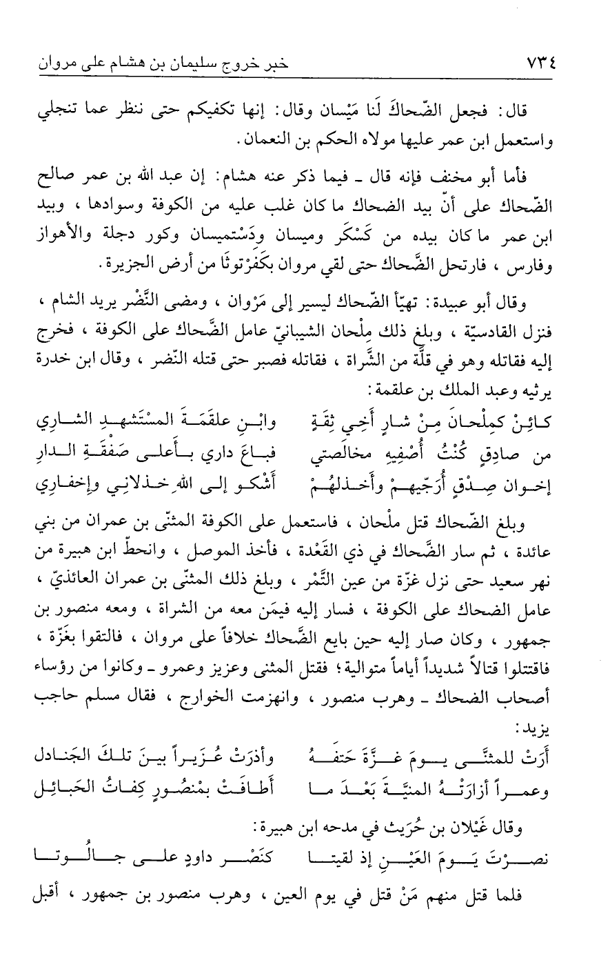 فأما أبو مخنف فإنه قال - فيما ذكر عنه هشام: إن عبد الله بن عمر صالح الضّحاك على أنّ بيد الضحاك ما كان غلب عليه من الكوفة وسوادها، وبيد ابن عمر ما كان بيده من كَسْكَر وميسان وِدَسْتميسان وكور دجلة والأهواز وفارس، فارتحل الضَّحاك حتى لقي مروان بكَفرْتوثَا من أرض الجزيرة.