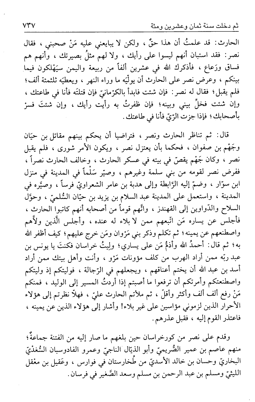 قال: ثم تناظر الحارث ونصر، فتراضيا أن يحكم بينهم مقاتل بن حيَان وجَهْم بن صفوان، فحكما بأن يعتزل نصر، ويكون الأمر شورى، فلم يقبل نصر، وكان جَهْم يقصّ في بيته في عسكر الحارث، وخالف الحارث نصرًا، ففرض نصر لقومه من بني سلمة وغيرهم، وصيّر سَلْمًا في المدينة في منزل ابن سوّار، وضمّ إليه الرَّابطة وإلى هدبة بن عامر الشعراويّ فرسًا، وصيَّره في المدينة، واستعمل على المدينة عبد السلام بن يزيد بن حيّان السُّلميّ، وحوَّل السلاح والدّواوين إلى القهندز، واتَّهم قومًا من أصحابه أنهم كاتبوا الحارث، فأجلس عن يساره مَن اتّبعهم ممن لا بلاء له عنده، وأجلس الّذَين ولَّاهم واصطنعهم عن يمينه؛ ثم تكلم وذكر بني مَرْوان ومَن خرج عليهم؛ كيف أظفر الله به؛ ثم قال: أحمدُ الله وأذمُّ مَن على يساري؛ وليتُ خراسان فكنتَ يا يونس بن عبد ربّه ممن أراد الهرب من كلف مؤونات مَرْو، وأنت وأهل بيتك ممن أراد أسد بن عبد الله أن يختم أعناقهم، ويجعلهم في الرّجالة، فوليتكم إذ وليتكم واصطنعتكم وأمرتكم أن ترفعوا ما أصبتم إذا أردتُ المسير إلى الوليد، فمنكم مَنْ رفع ألف ألف وأكثر وأقلّ، ثم ملأتم الحارث عليّ، فهلّا نظرتم إلى هؤلاء الأحرار الذين لزموني مؤاسين على غير بلاء! وأشار إلى هؤلاء الذين عن يمينه، فاعتذر القوم إليه، فقبل عذرهم.