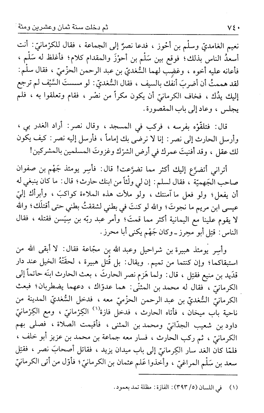 وأسِر يومئذ هبيرة بن شراحيل وعبد الله بن مجّاعة فقال: لا أبقى الله من استبقاكما؛ وإن كنتما من تميم. ويقال: بل قُتل هبيرة، لحقَتْهُ الخيل عند دار قدَيد بن منيع فقتِل، قال: ولما هَزم نصر الحارثَ، بعث الحارث ابنَه حاتمًا إلى الكرمانيّ، فقال له محمد بن المثنّى: هما عدوّاك، دعهما يضطربان؛ فبعث الكرمانيّ السُّغديّ بن عبد الرحمن الحزْميّ معه، فدخل السُّغديّ المدينة من ناحية باب ميخان، فأتاه الحارث، فدخل فازة (١) الكِرْمانيّ، ومع الكِرْمانيّ داود بن شعيب الجدّانيّ ومحمد بن المثنى، فأقيمت الصلاة، فصلى بهم الكرمانيّ، ثم ركب الحارث، فسار معه جماعة بن محمد بن عزيز أبو خلف، فلمّا كان الغد سار الكِرمانيّ إلى باب ميدان يزيد، فقاتل أصحابَ نصر، فقتِل سعد بن سَلْم المراغيّ، وأخذوا عَلم عثمان بن الكرمانيّ؛ فأوّل من أتى الكرمانيّ