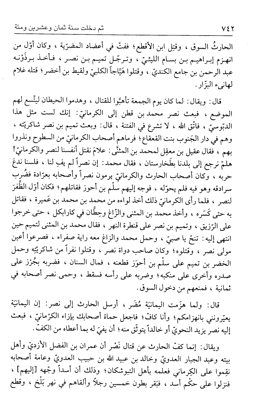 قال: ويقال: لما كان يوم الجمعة تأهبَّوا للقتال، وهدموا الحيطان ليتَّسع لهم الموضع، فبعث نصر محمد بن قطن إلى الكرمانيّ: إنك لست مثل هذا الدبّوسيّ، فاتق الله، لا تشرع في الفتنة، قال: وبعث تميم بن نصر شاكريّته، وهم في دار الجَنوب بنت القعقاع؛ فرماهم أصحاب الكرمانيّ من السطوح ونذروا بهم، فقال عقيل بن معقِل لمحمد بن المثنَّى: علامَ نقتل أنفسنا لنصر والكرمانيّ! هلمّ نرجع إلى بلدنا بطَخارستان، فقال محمد: إن نصرًا لم يفِ لنا، فلسنا ندعَ حربه، وكان أصحاب الحارث والكرمانيّ يرمون نصرًا وأصحابه بعرّادة فضُرب سرادقه وهو فيه فلم يحوّله، فوجه إليهم سلْم بن أحوز فقاتلهم؛ فكان أوّل الظَّفرَ لنصر، فلما رأى الكرمانيّ ذلك أخذ لواءه من محمد بن محمد بن عَميرة، فقاتل به حتى كَسَره، وأخذ محمد بن المثنى والزّاغ وحِطَّان في كارابكل، حتى خرجوا على الرّزيق، وتميم بن نصر على قنطرة النهر، فقال محمد بن المثنى لتميم حين انتهى إليه: تنحّ يا صبيّ، وحمل محمد والزاغ معه راية صفراء، فصرعوا أعين مولى نصر، وقتلوه؛ وكان صاحب دواة نصر، وقتلوا نفرًا من شاكريّتِه وحمل الخضر بن تميم على سلْم بن أحوَز فطعنه، فمال السنان، فضربه بجُرْز على صدره وأخرى على منكبه؛ وضربه على رأسه فسقط، وحمى نصر أصحابه في ثمانية، فمنعهم من دخول السوق.