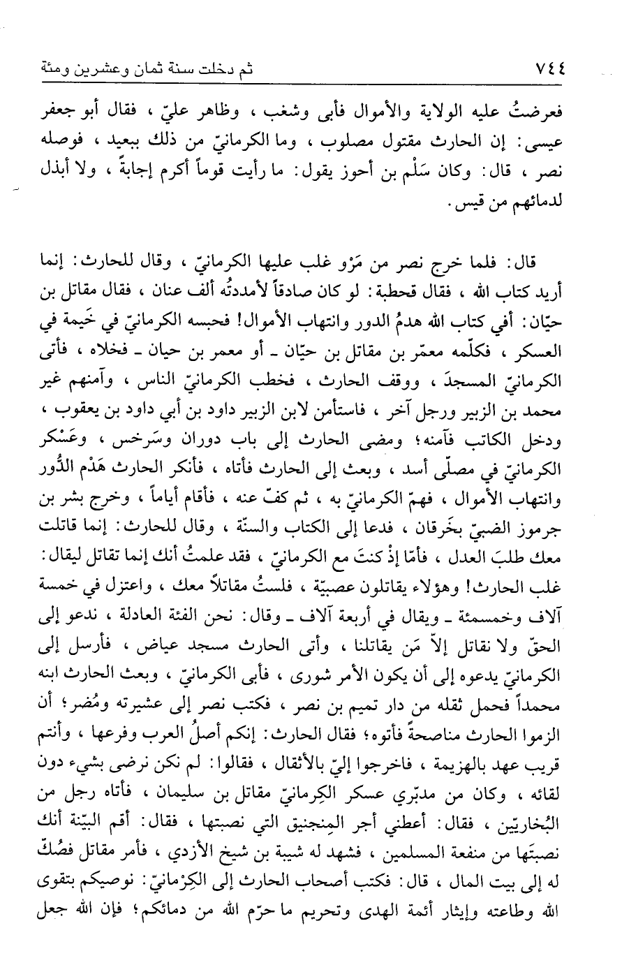 قال: فلما خرج نصر من مَرْو غلب عليها الكرمانيّ، وقال للحارث: إنما أريد كتاب الله، فقال قحطبة: لو كان صادقًا لأمددتُه ألف عنان، فقال مقاتل بن حيّان: أفي كتاب الله هدمُ الدور وانتهاب الأموال! فحبسه الكرمانيّ في خَيمة في العسكر، فكلّمه معمّر بن مقاتل بن حيّان - أو معمر بن حيان - فخلاه، فأتى الكرمانيّ المسجدَ، ووقف الحارث، فخطب الكرمانيّ الناس، وآمنهم غير محمد بن الزبير ورجل آخر، فاستأمن لابن الزبير داود بن أبي داود بن يعقوب، ودخل الكاتب فآمنه؛ ومضى الحارث إلى باب دوران وسَرخس، وعَسْكر الكرمانيّ في مصلّى أسد، وبعث إلى الحارث فأتاه، فأنكر الحارث هَدْم الدُّور وانتهاب الأموال، فهمّ الكرمانيّ به، ثم كفّ عنه، فأقام أيامًا، وخرج بشر بن جرموز الضبيّ بخَرقان، فدعا إلى الكمَاب والسنّة، وقال للحارث: إنما قاتلت معك طلبَ العدل، فأمّا إذْ كنتَ مع الكرمانيّ، فقد علمتُ أنك إنما تقاتل ليقال: غلب الحارث! وهؤلاء يقاتلون عصبيّة، فلستُ مقاتلًا معك، واعتزل في خمسة آلاف وخمسمئة - ويقال في أربعة آلاف - وقال: نحن الفئة العادلة، ندعو إلى الحقّ ولا نقاتل إلّا مَن يقاتلنا، وأتى الحارث مسجد عياض، فأرسل إلى الكرمانيّ يدعوه إلى أن يكون الأمر شورى، فأبى الكرمانيّ، وبعث الحارث ابنه محمدًا فحمل ثقله من دار تميم بن نصر، فكتب نصر إلى عشيرته ومُضر؛ أن الزموا الحارث مناصحةً فأتوه؛ فقال الحارث: إنكم أصلُ العرب وفرعها، وأنتم قريب عهد بالهزيمة، فاخرجوا إليّ بالأثقال، فقالوا: لم نكن نرضى بشيء دون لقائه، وكان من مدبّري عسكر الكِرمانيّ مقاتل بن سليمان، فأتاه رجل من البُخاريّين، فقال: أعطني أجر المِنجنيق التي نصبتها، فقال: أقم البيّنة أنك نصبتَها من منفعة المسلمين، فشهد له شيبة بن شيخ الأزدي، فأمر مقاتل فصُكّ له إلى بيت المال، قال: فكتب أصحاب الحارث إلى الكِرْمانيّ: نوصيكم بتقوى الله وطاعته وإيثار أئمة الهدى وتحريم ما حرّم الله من دمائكم؛ فإن الله جعل